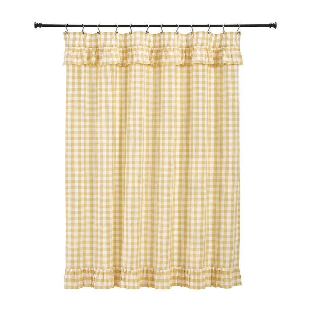 Decorate your bathroom with the perfect blend of simplicity and country charm with the Annie Buffalo Yellow Check Ruffled Check Shower Curtain. Featuring large scale golden yellow and white checks beautifully accented with ruffles, our 72x72 fabric shower curtain provides a vintage, farmhouse touch to your decor. This machine washable, 100% cotton shower curtain includes button holes for shower hooks and a rod pocket for versatility and convenience.