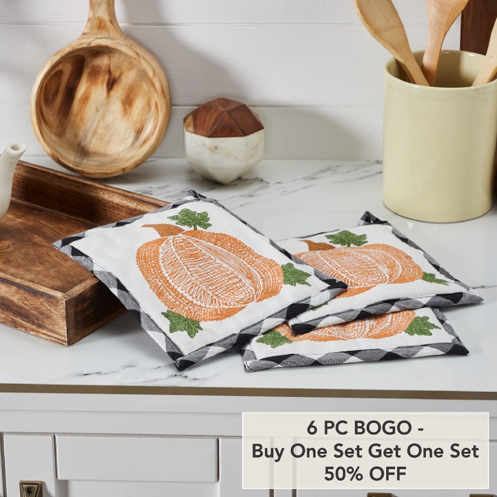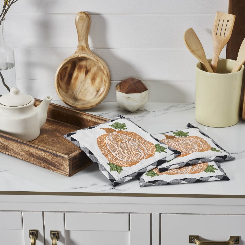 - Sku – 84007 – Annie Farmhouse Black Buffalo Check Pumpkin Quilted Cotton Trivet Hot Pad Set of 3 Fall Harvest Kitchen & Table Decor, 8×8 (2 Packages)