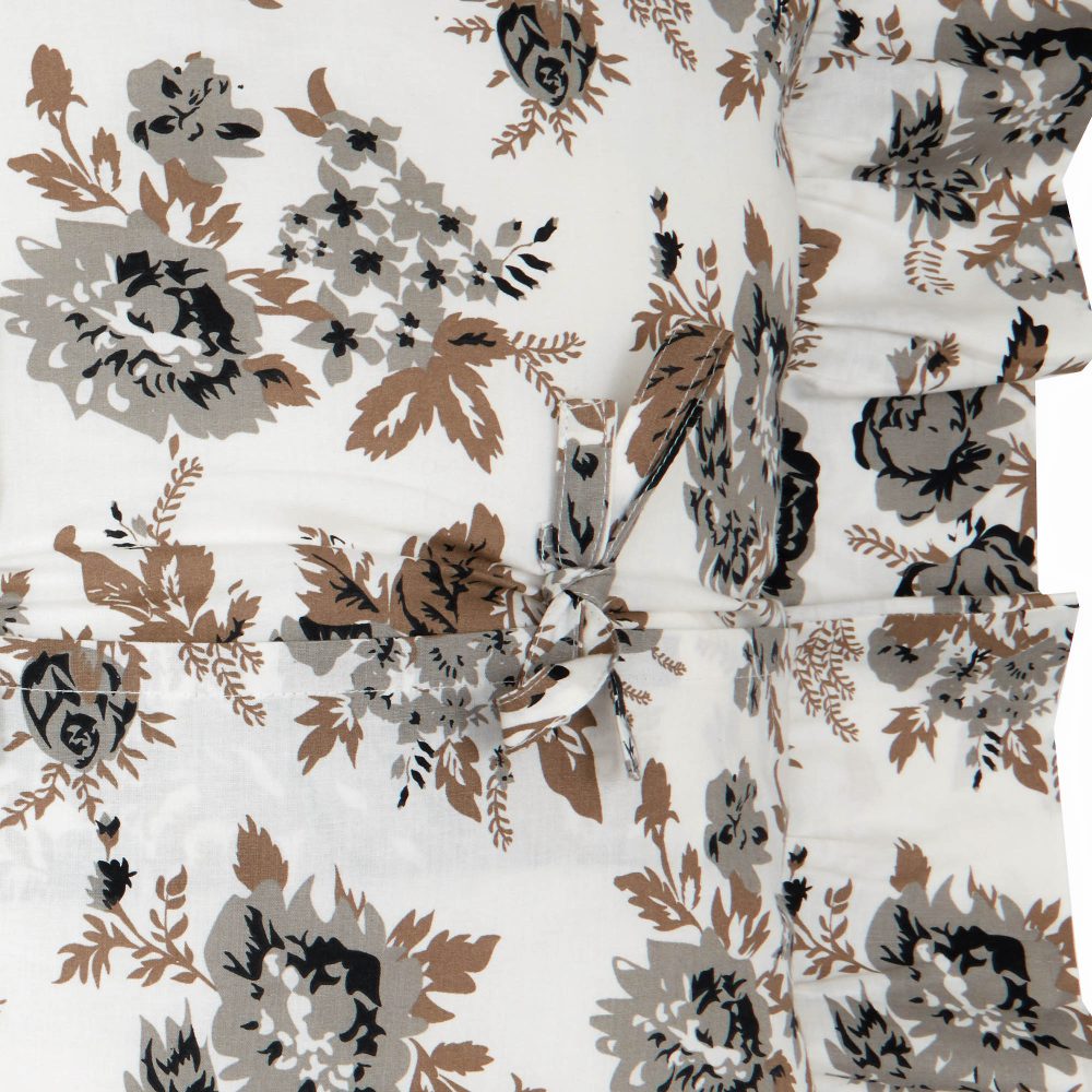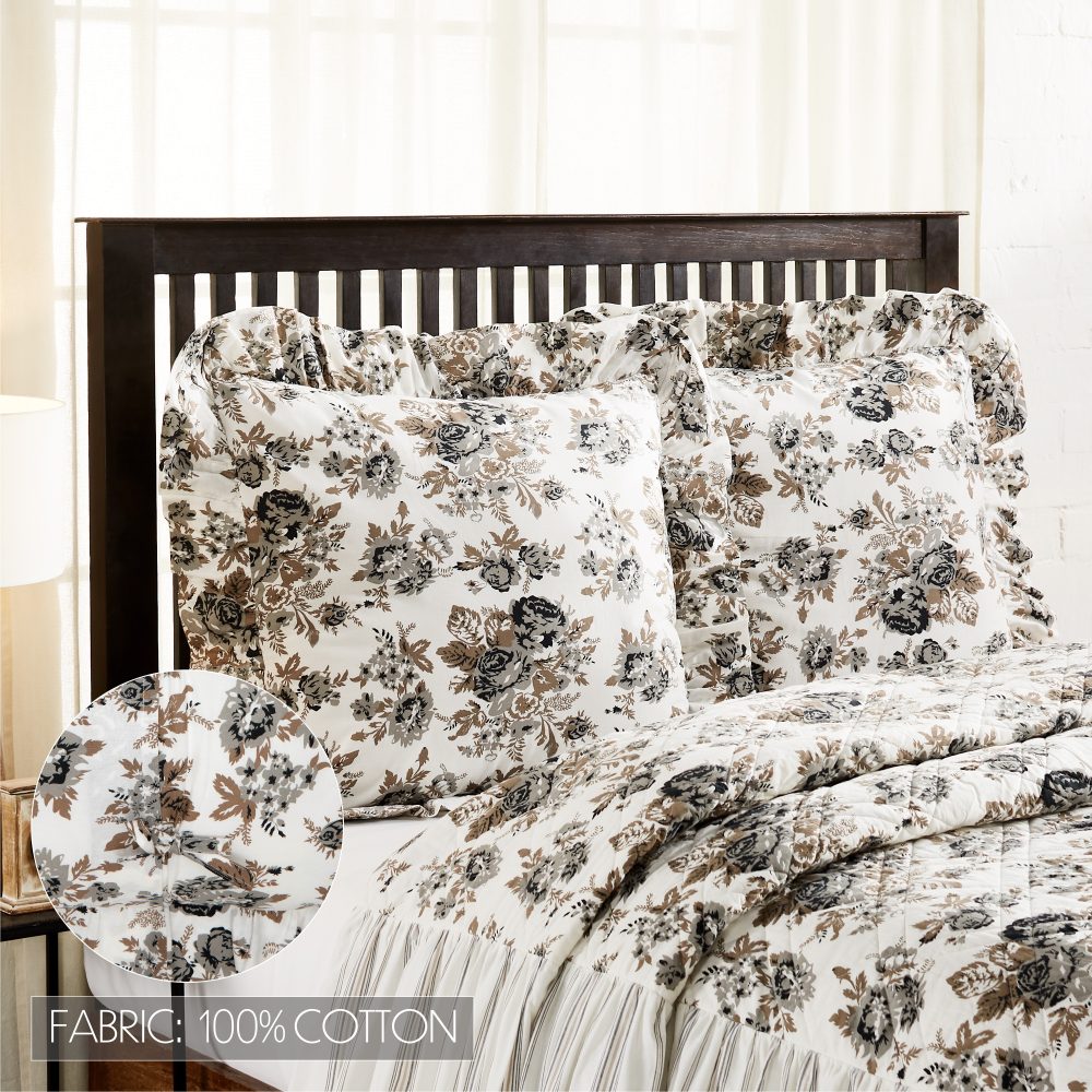 Accent your cozy cottage bedroom with vintage, toile-inspired floral in elegant, neutral colors. The Annie Portabella Floral Fabric Euro Sham includes one 26x26 euro sham pillow cover. European pillow shams are a great way to add a finishing touch to country farmhouse bedding for a sophisticated, feminine feel. This cotton pillow case includes a three inch ruffle and beautiful vintage floral. The delightful print features a white base with a softly printed portabella brown and warm grey motif that will match any cottage or French country-style bedding sets. The decorative pillow cover includes the same fabric on both the front and back with a tie closure to hold your fill pillow (not included) in securely. Machine washable and iron safe.