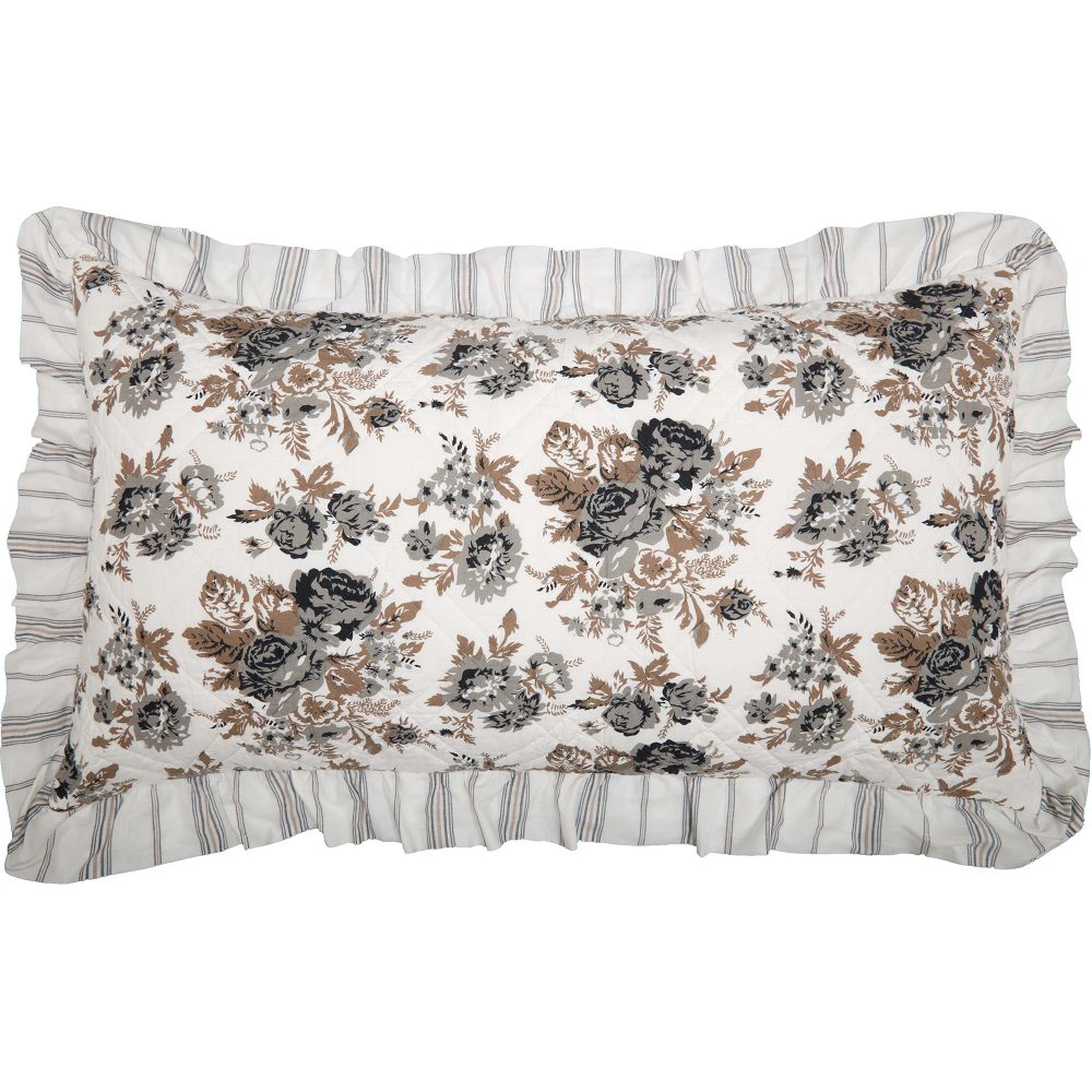 Accent your French country bedroom with toile-inspired patterns and soft ruffles. The Annie Portabella Floral Ruffled King Sham includes one 21x37 sham pillow cover. Ruffled pillow shams are a great way to add a finishing touch to country cottage bedding for a perfectly cozy and put-together feel. This cotton pillow sham includes a three inch striped ruffle and a delightful vintage floral pattern in portabella brown and warm grey. The decorative pillow case reverses to tan and white buffalo check pattern with a tie closure to hold your fill pillow (not included) in securely. Machine washable and iron safe.
