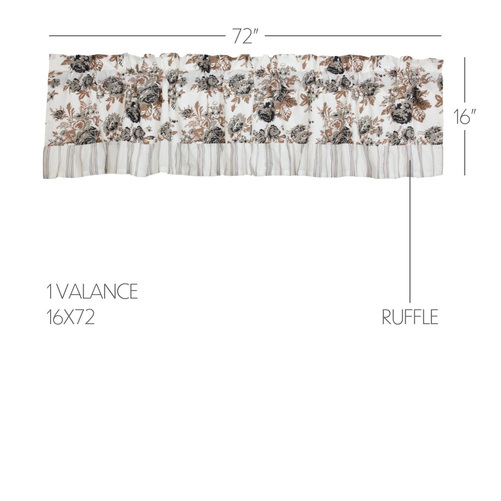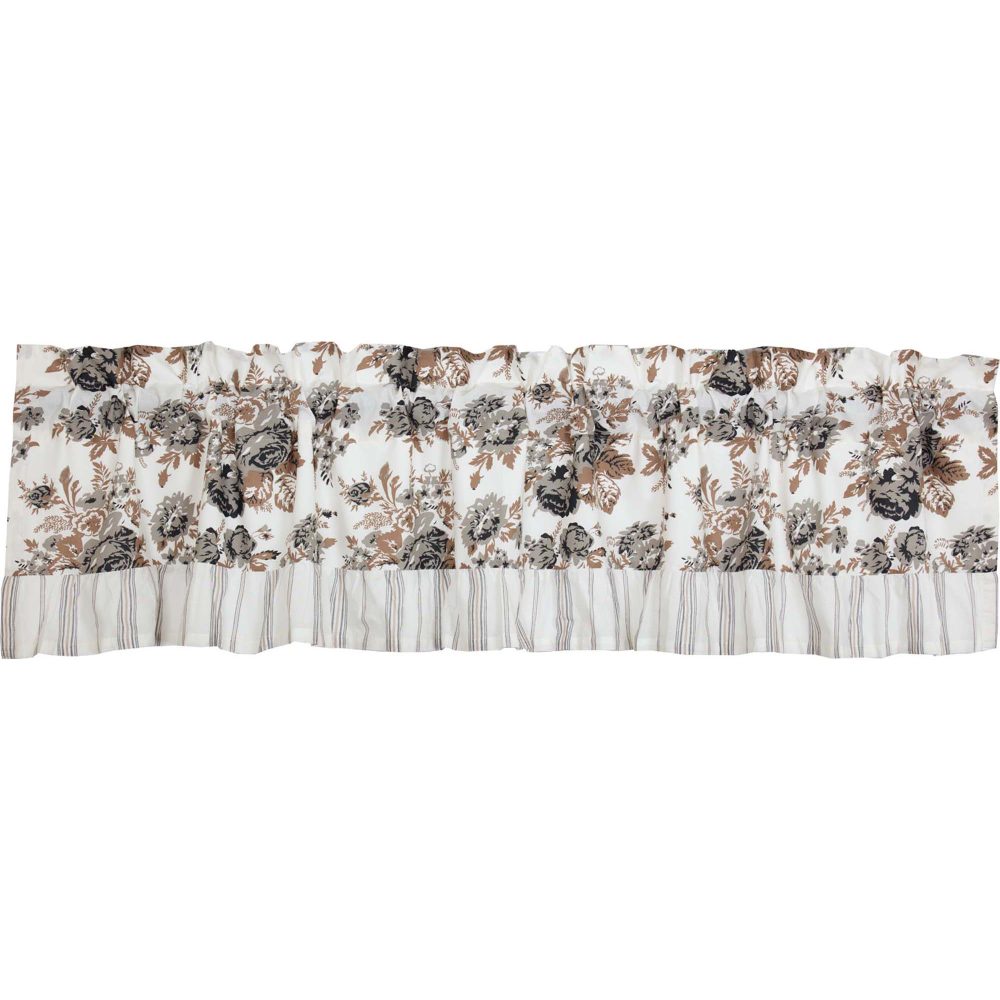 Brighten up your windows with cozy elegance and vintage charm. Our Annie Portabella Floral Ruffled Valance Curtain 16x72 features an eye-catching, toile-inspired floral print in calming colors of portabella brown, soft white, and warm grey. Gracefully trimmed with ruffles for added texture and charm. This farmhouse kitchen curtain is finished with a white cotton lining to help filter light and prevent fading.