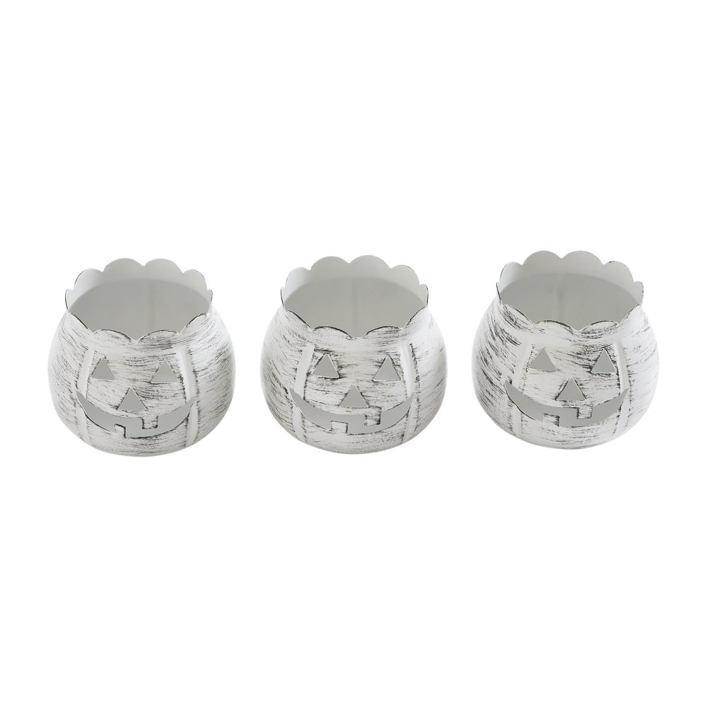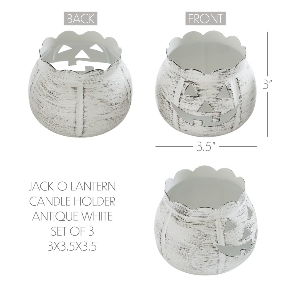 • DETAILED CRAFTSMANSHIP & DIMENSIONS: Crafted from durable metal for lasting quality, this set of three antique white Jack-O-Lantern candle holders showcases detailed features including a classic pumpkin shape with iconic grins, a delicately scalloped rim, and a subtly distressed finish, with each piece precisely measuring 3 inches wide by 3.5 inches high (3″W x 3.5″H) to perfectly accommodate votive or tealight candles on any tabletop or centerpiece.