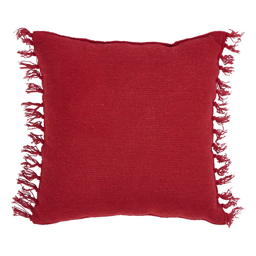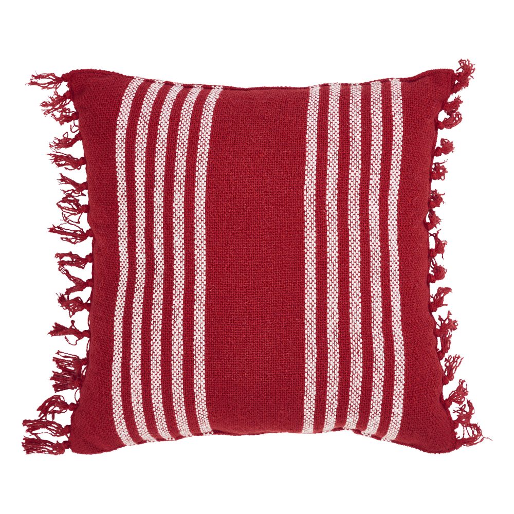 Add a little pop of festive style with this bright red Christmas accent pillow. The Arendal Pillow measures 12 by 12 inches and features a dramatic tasseled edging. The filled pillow includes a bold red base with two simple sets of five soft white stripes on the front. The cozy home accessory reverses to simple red fabric. Spot clean as needed. Coordinates with the Arendal Collection by VHC for modern, Nordic Christmas style for your whole home.