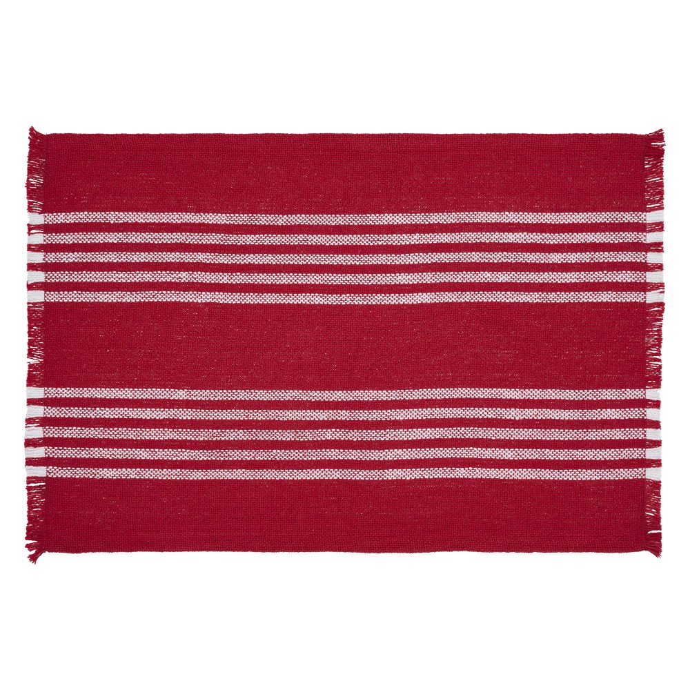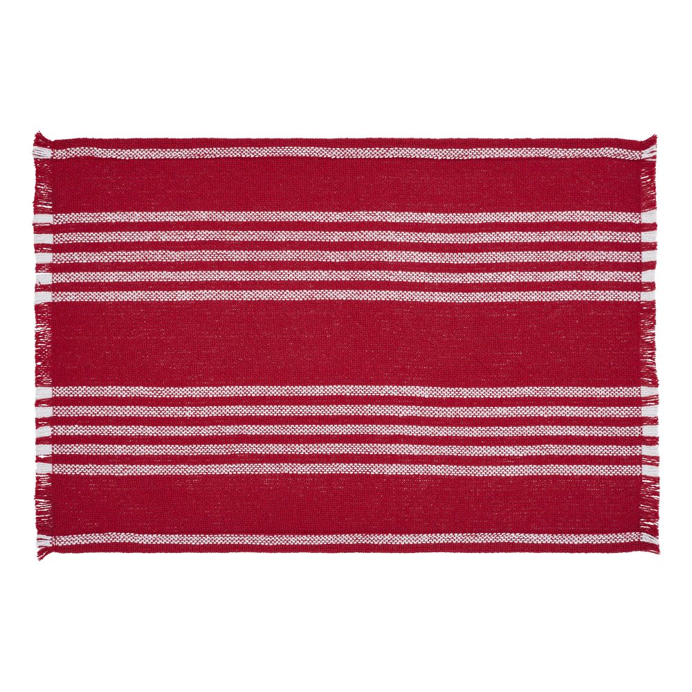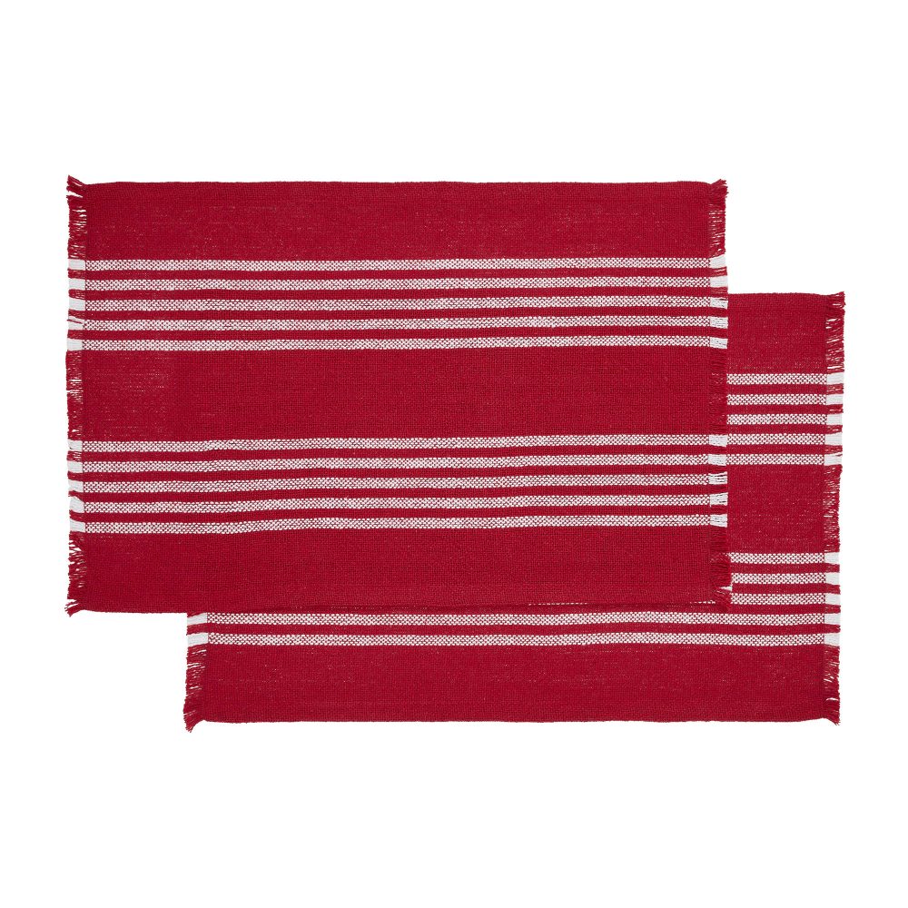 Create a bright and cozy tabletop with the Arendal Red Stripe Placemat Set. The holiday placemat set includes a set of two 13x19 placemats in bold red and soft white for a relaxed Christmas tabletop. The bold red base features two sets of five white horizontal stripes that are perfect for creating a soft, Scandinavian Christmas feel. Soft fringed edging adds an extra pop of texture to complete the look. Coordinates with the Arendal Collection by VHC for simple, classic Christmas style for the home.