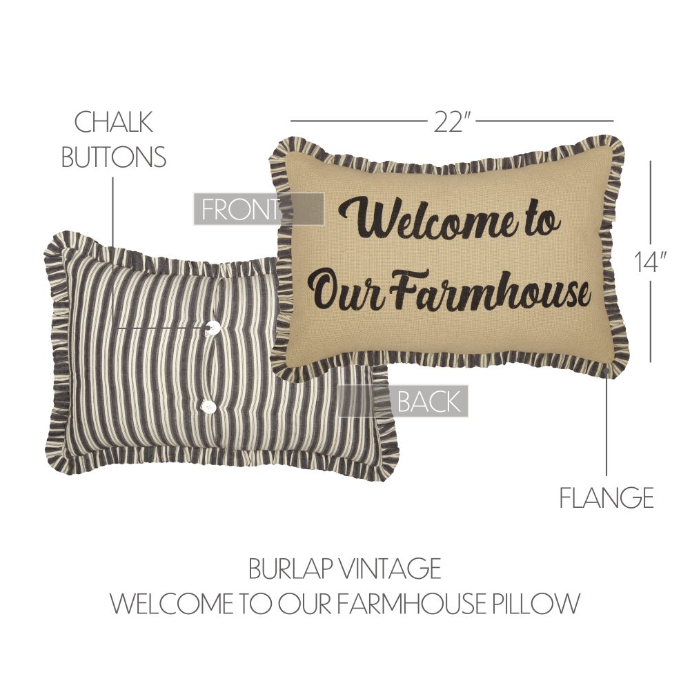 Texture meets farmhouse charm with this versatile 14x22 inch decorative accent pillow. The Ashmont Burlap Vintage Welcome to Our Farmhouse Pillow features a natural burlap front and a striped seersucker back with neat, ruffled edging. The warm tan of the soft burlap provides a base for deep black stenciled word art reading, "Welcome to Our Farmhouse" in an elegant script. The removable rustic pillow cover is made from 100 percent cotton and includes polyester fill. Includes button style closures for easy cleaning. Pair this modern farmhouse throw pillow with other accent or foundational pieces from the Ashmont Collection for a casual modern farmhouse look. Add to a sofa or chair for a cozy lumbar pillow. Machine washable and iron safe.