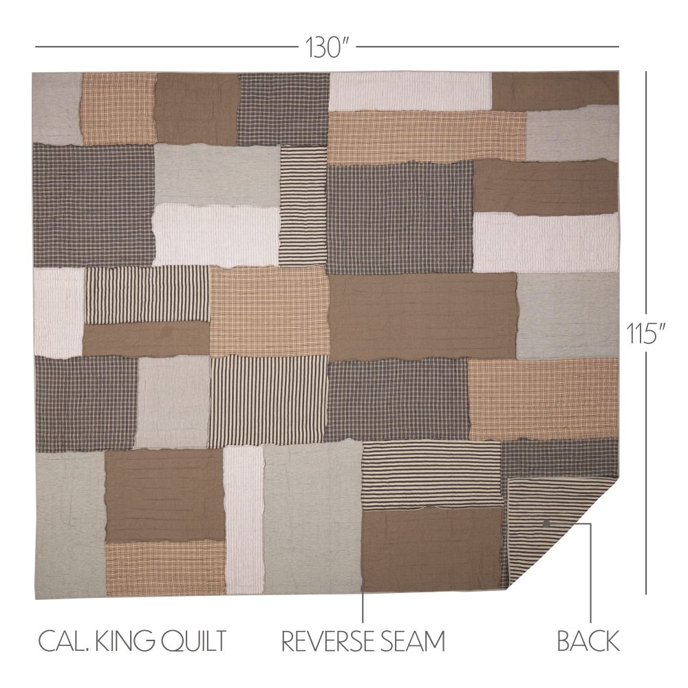 Casual home decor brings together the best of livable style with cozy, welcoming colors and patterns for a timeless look with heirloom quality. The Ashmont California King Quilt is an excellent example of vintage style meeting modern comfort. Measuring 130 by 115 inches, this oversized quilted bedspread features uneven blocks in a muted patchwork of grey, vintage white, tans, and deep blues. Reverse stitching on the front is reminiscent of vintage rag quilts and adds extra dimension and texture to the overall look. Reverses to charcoal and creme ticking stripe. Machine washable and iron safe. For best results, air dry. Coordinates with the Ashmont Collection by VHC for vintage farmhouse style with the quality you would expect from over 20 years of happy customers.