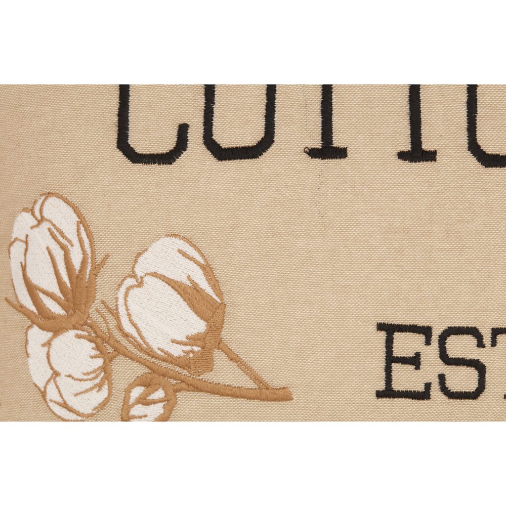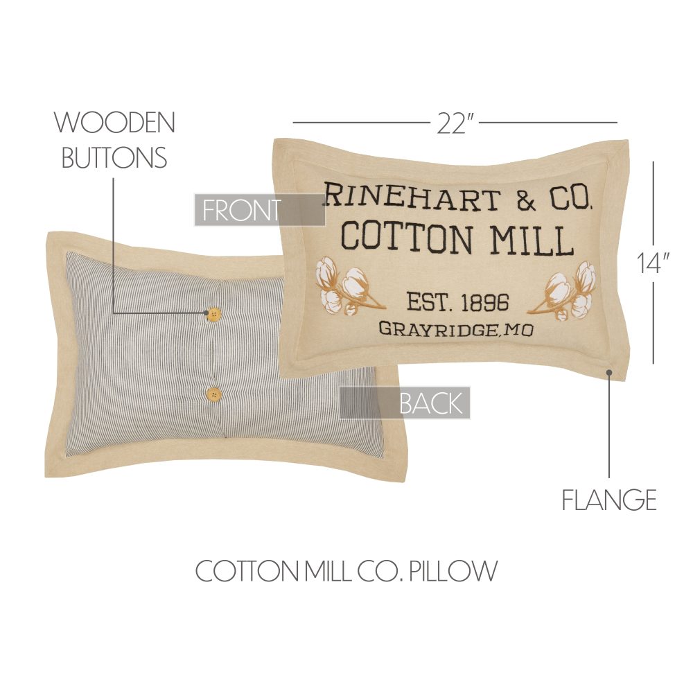 Vintage farmhouse colors and detailed embroidery create a warm, cozy accent piece for your modern country home. The Ashmont Cotton Mill Co. Pillow measures 14x22 inches for a versatile size that adds style and lumbar support for any seat. The front features a soft tan fabric with detailed embroidery of delicate cotton sprigs and the words, "Rinehart & Co. Cotton Mill". Back features a soft striped pattern in washed blue with button-style closures. Features a removable cotton pillow cover for easy cleaning and a polyester fill. Coordinates with the Ashmont Collection from VHC for accent and foundational pieces in a warm, casual farmhouse style.