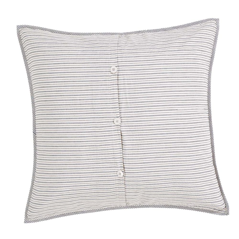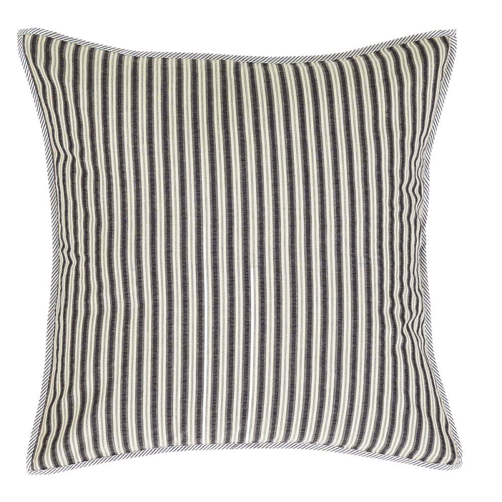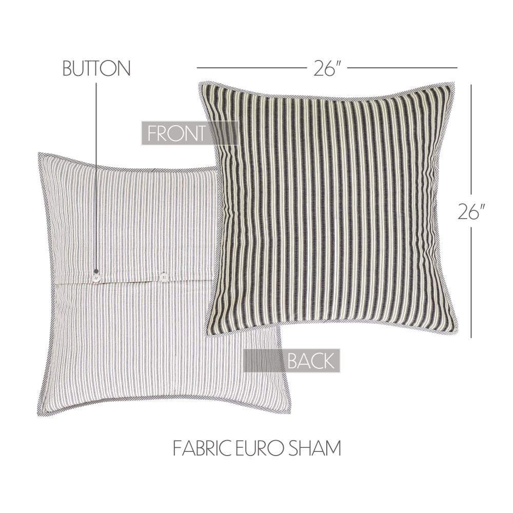 Antique white and charcoal grey ticking stripes provide a masculine, vintage look to complete your farmhouse bedding or provide an accent for any couch or chair. The Ashmont Fabric Euro Sham measures 26x26 inches and features a mix of striped cotton fabrics in neutral tones to perfectly complement classic farmhouse decor. The back of the euro pillow case features a thinner stripe in lighter warm grey and white with button closures to securely hold your fill pillow (not included) in place. The sham was designed to effortlessly blend with casual farmhouse looks and can be displayed on both sides for greater variety in styling options. Coordinates with the Ashmont Collection by VHC for a complete country casual look for your room. Machine washable and iron safe.