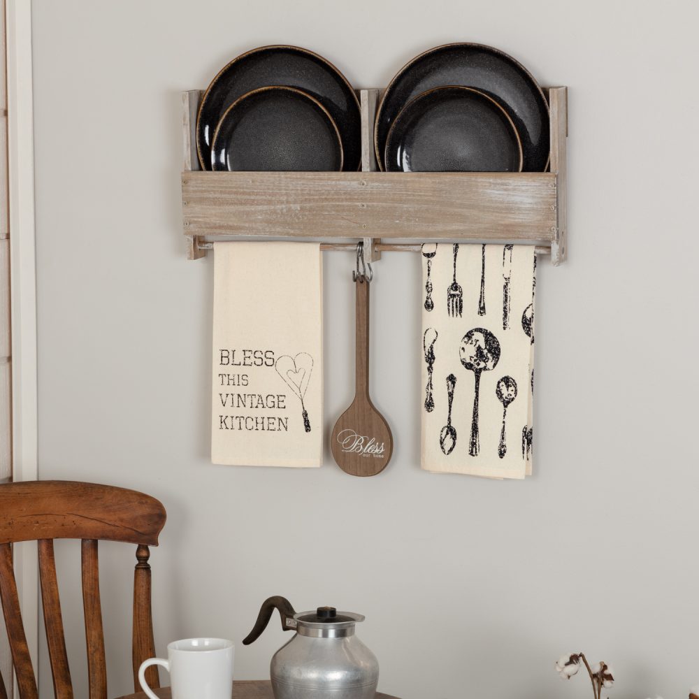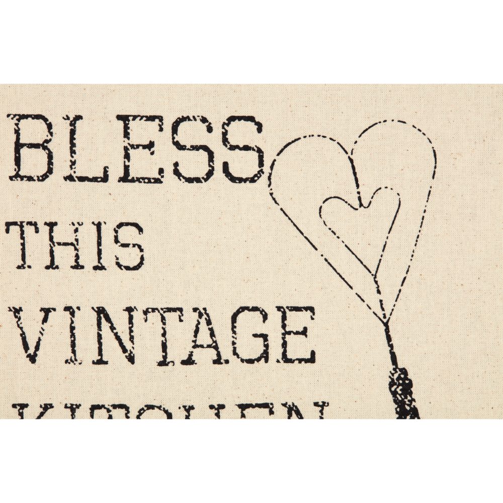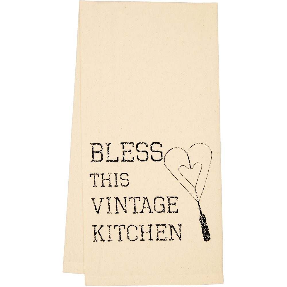 - DURABLE KITCHEN TOWELS: The durable cotton muslin of these tea towels absorbs water without losing quality; The weathered look of the words "Bless This Vintage Kitchen" brings a timeless feel to any farmhouse kitchen.
