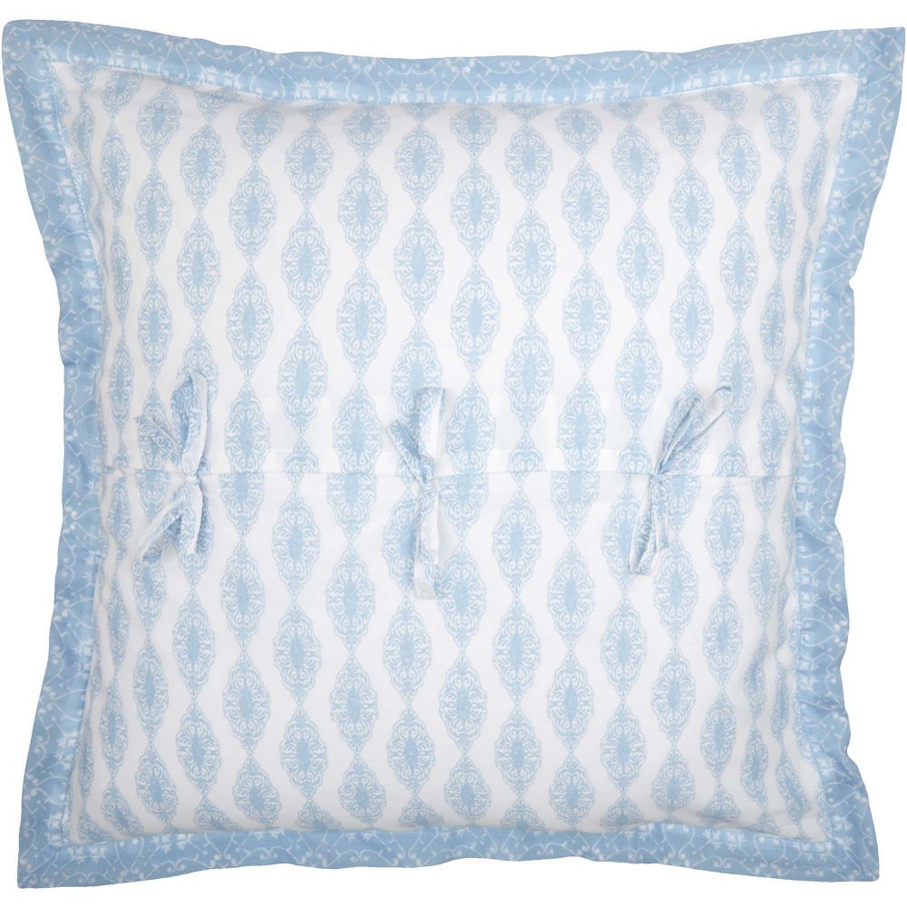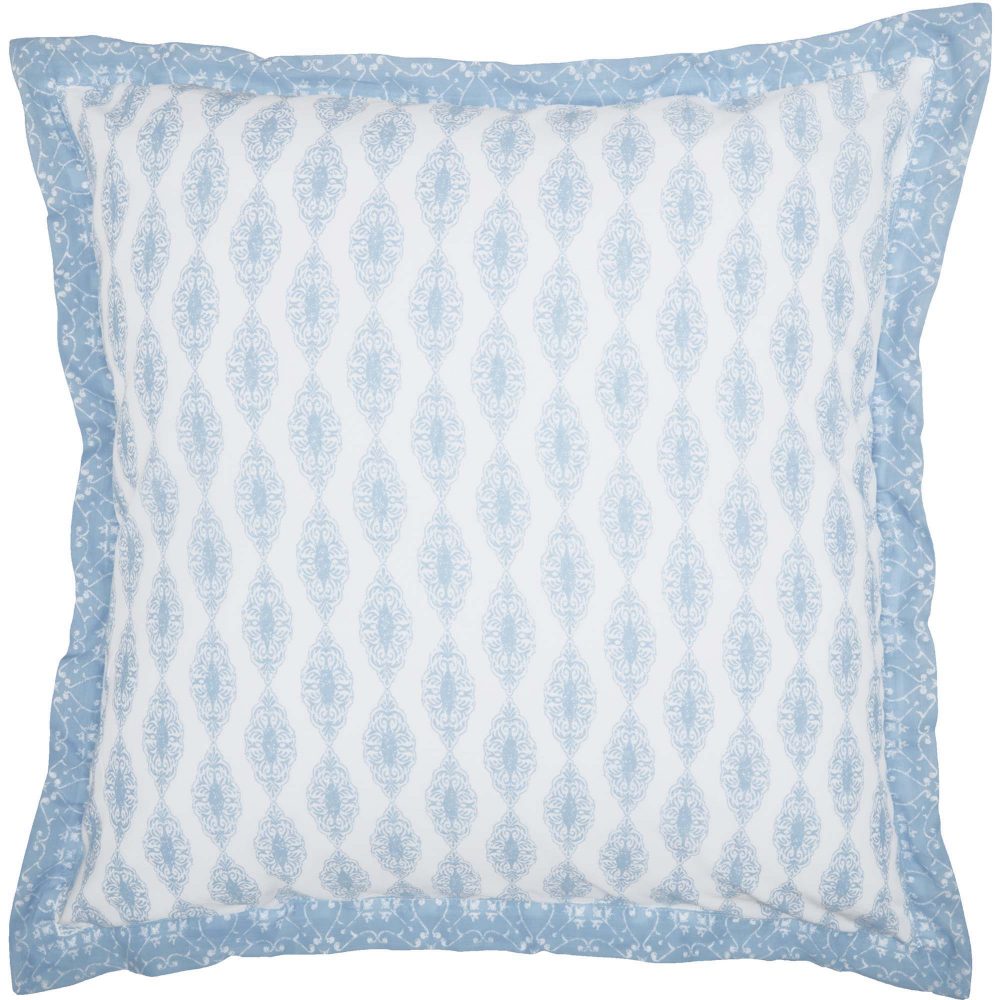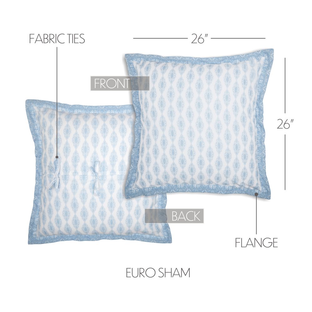 You love clean, white bedding bathed in morning light. The Avani Blue Euro Sham is perfect for bright spaces with its fresh white base and distressed paisley detailing in soft, powder blue. It measures 26x26 inches and includes a delicate flange-style edge in powder blue for an additional pop of soft color. The country boho sham features the same fabric on both the front and back and includes a tie closure to hold your fill pillow (not included) in securely. Coordinates with the Avani Collection by VHC for a complete shabby chic look for your room. Machine washable and iron safe.