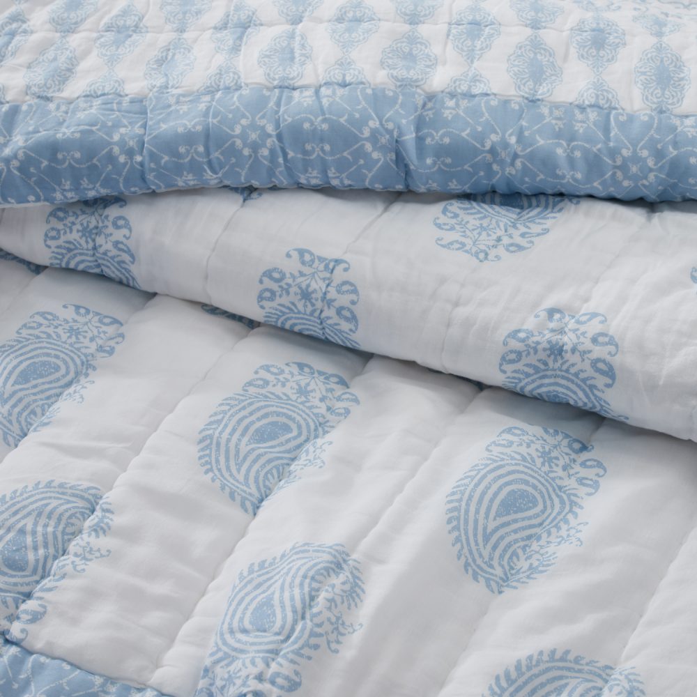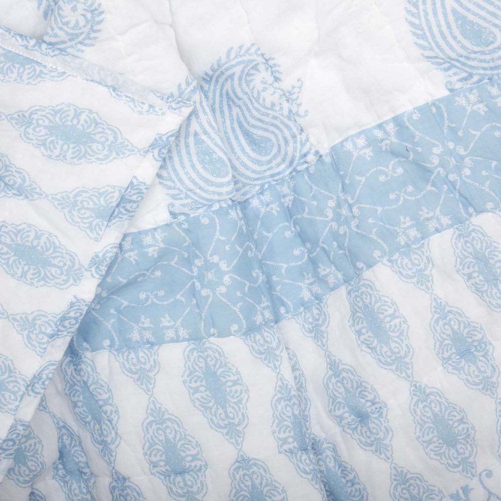 Dress your bed with playful colors and a unique coastal meets country design. Our Avani Blue Luxury King Quilt measures 120 by 105 inches and features refreshing powder blue and white tones in a distressed paisley pattern perfectly suited for any bohemian farmhouse bedroom. Machine washable and iron safe, this cozy quilted bedspread is both practical and stylish. Includes a 100 percent cotton shell and cotton batting for extra warmth. For a complete look, pair this quilted blanket with our Avani Blue bed skirt and shams.