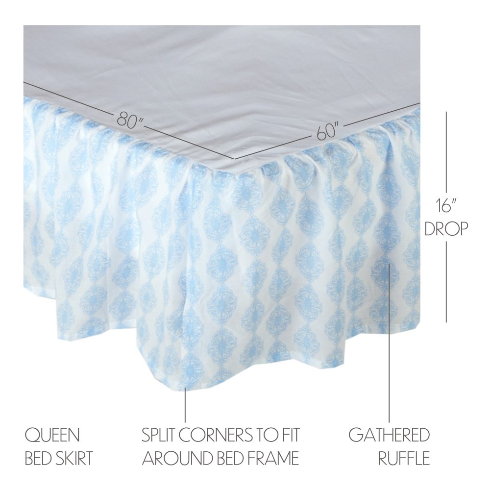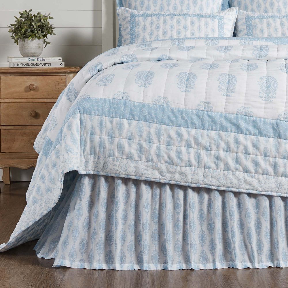 Dress your bed with playful colors and a unique coastal meets country design. Our Avani Blue Queen Bed Skirt 60x80x16 features refreshing light, powder blue and white tones in a distressed paisley pattern perfectly suited for any bohemian farmhouse bedroom. This cotton dust ruffle is both practical and stylish. It includes a split corner design to make corners a snap. Slight ruffling provides an easy way to add put-together charm to your bed while the long 16-inch drop makes sure your under-bed hardware and storage stay hidden from view. For a complete look, pair this cozy bed skirt with our Avani Blue Quilt and Shams. Machine washable and iron safe.