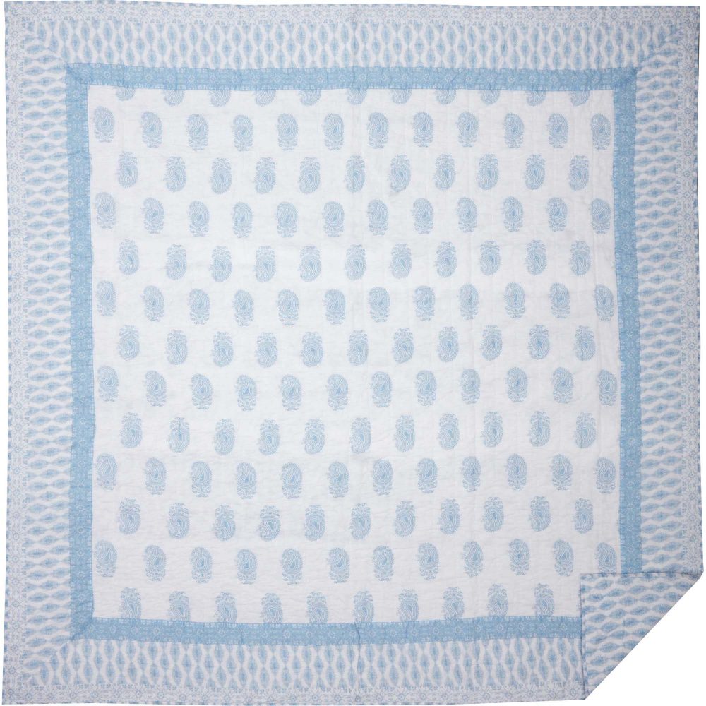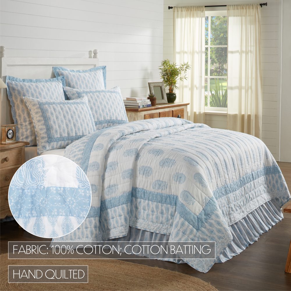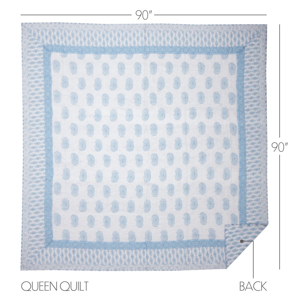 Dress your bed with playful colors and a unique coastal meets country design. Our Avani Blue Queen Quilt measures 90 by 90 inches and features refreshing powder blue and white tones in a distressed paisley pattern perfectly suited for any bohemian farmhouse bedroom. Machine washable and iron safe, this cozy quilted bedspread is both practical and stylish. Includes a 100 percent cotton shell and cotton batting for extra warmth. For a complete look, pair this quilted blanket with our Avani Blue bed skirt and shams.