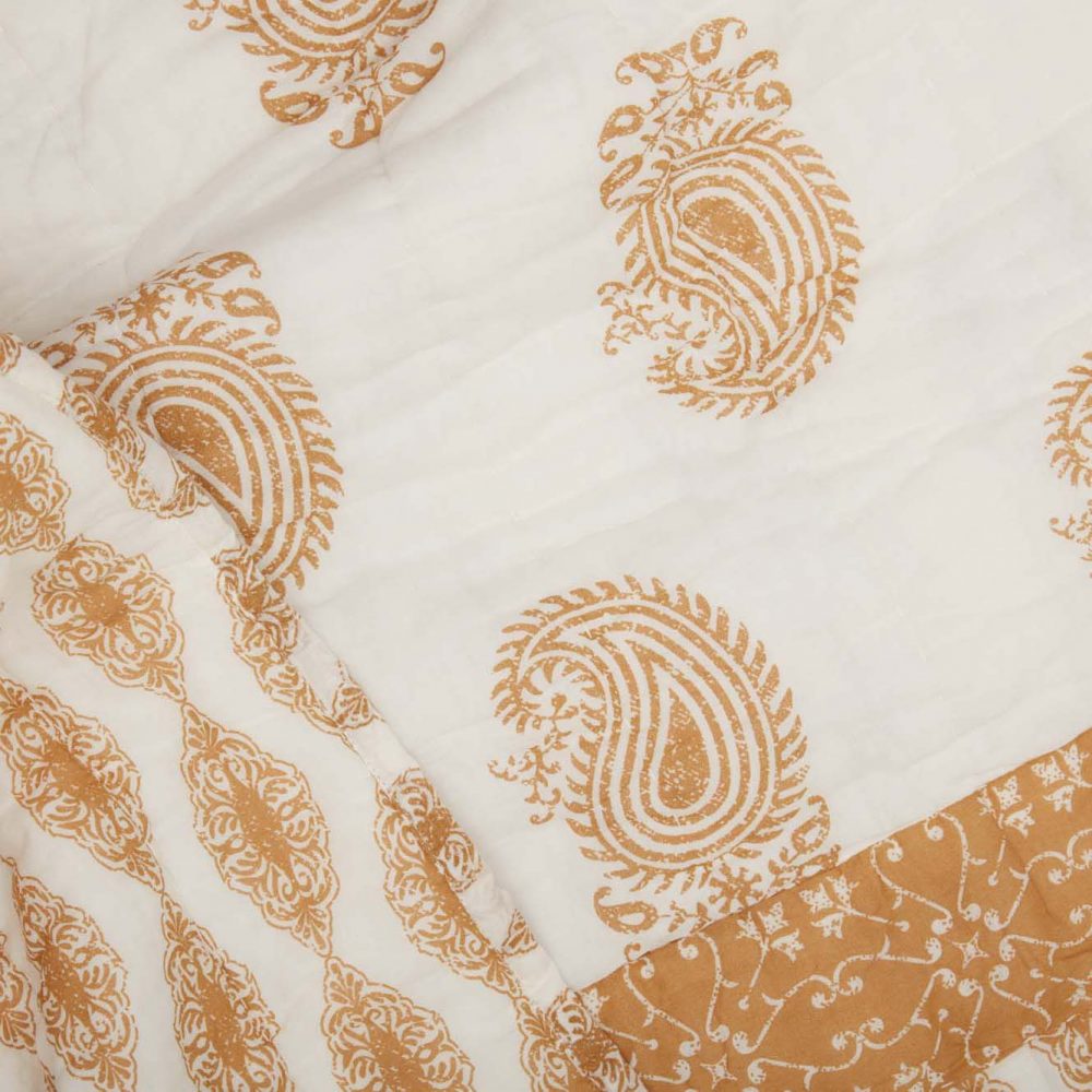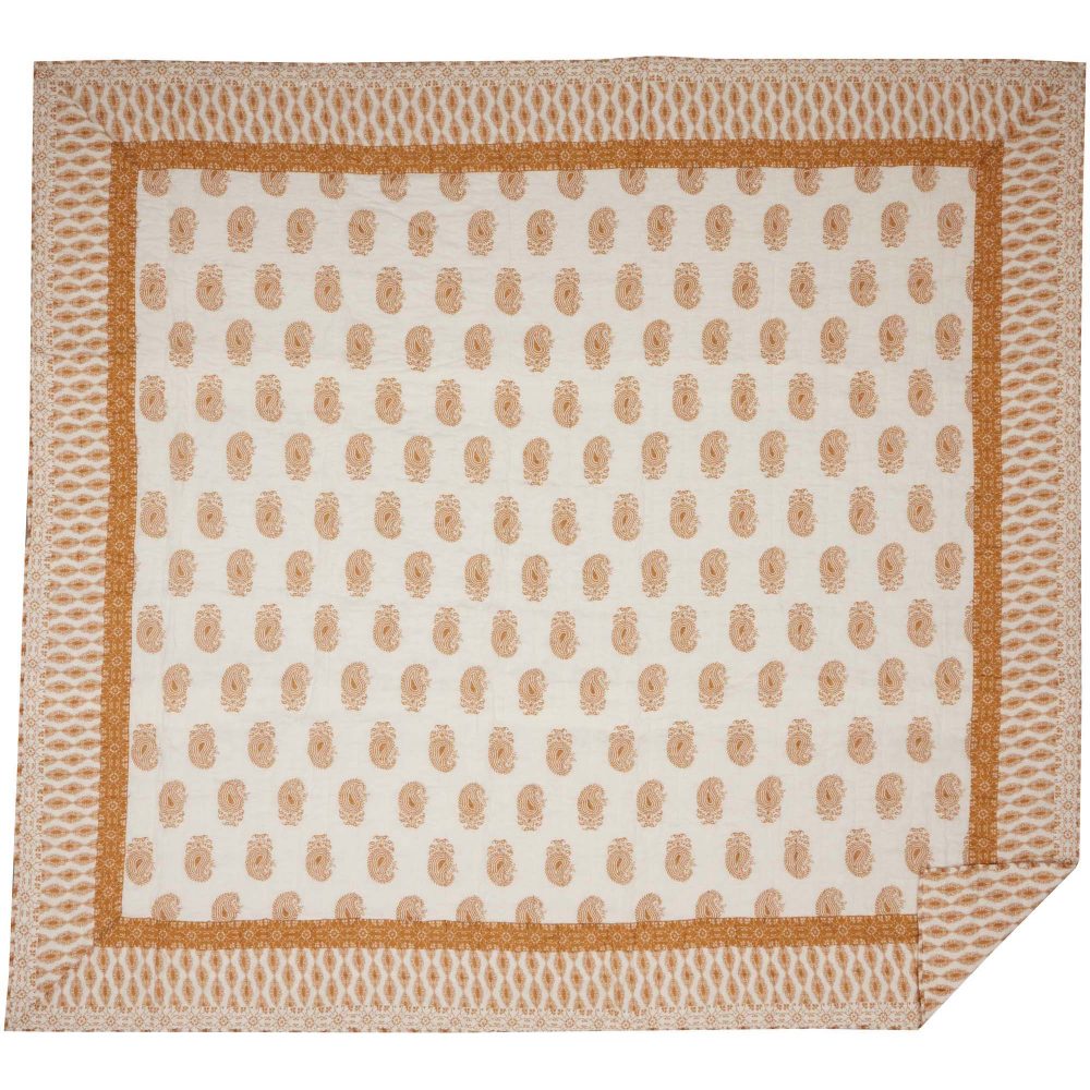 Dress your bed with playful colors and a unique coastal meets country design. Our Avani Gold King Quilt measures 105 by 95 inches and features refreshing gold and white tones in a distressed paisley pattern perfectly suited for any bohemian farmhouse bedroom. Machine washable and iron safe, this cozy quilted bedspread is both practical and stylish. Includes a 100 percent cotton shell and cotton batting for extra warmth. For a complete look, pair this quilted blanket with our Avani Gold bed skirt and shams.