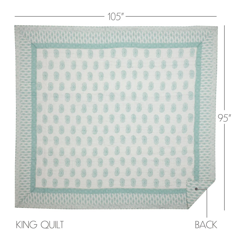 Dress your bed with playful colors and a unique coastal meets country design. Our Avani Sea Glass King Quilt measures 105 by 95 inches and features refreshing sea glass green and white tones in a distressed paisley pattern perfectly suited for any bohemian farmhouse bedroom. Machine washable and iron safe, this cozy quilted bedspread is both practical and stylish. Includes a 100 percent cotton shell and cotton batting for extra warmth. For a complete look, pair this quilted blanket with our Avani Sea Glass bed skirt and shams.