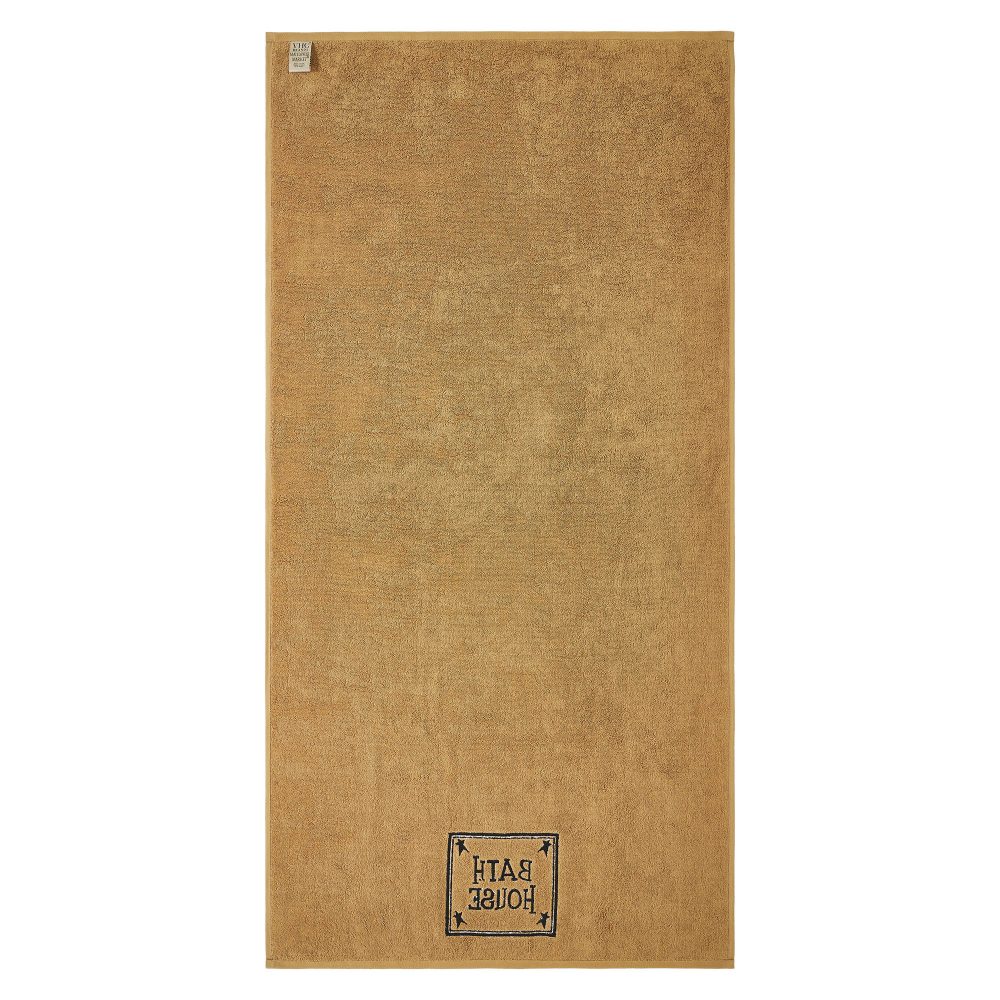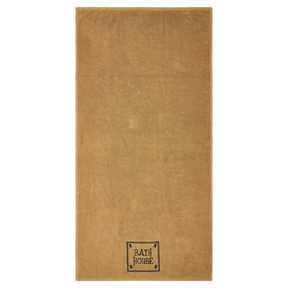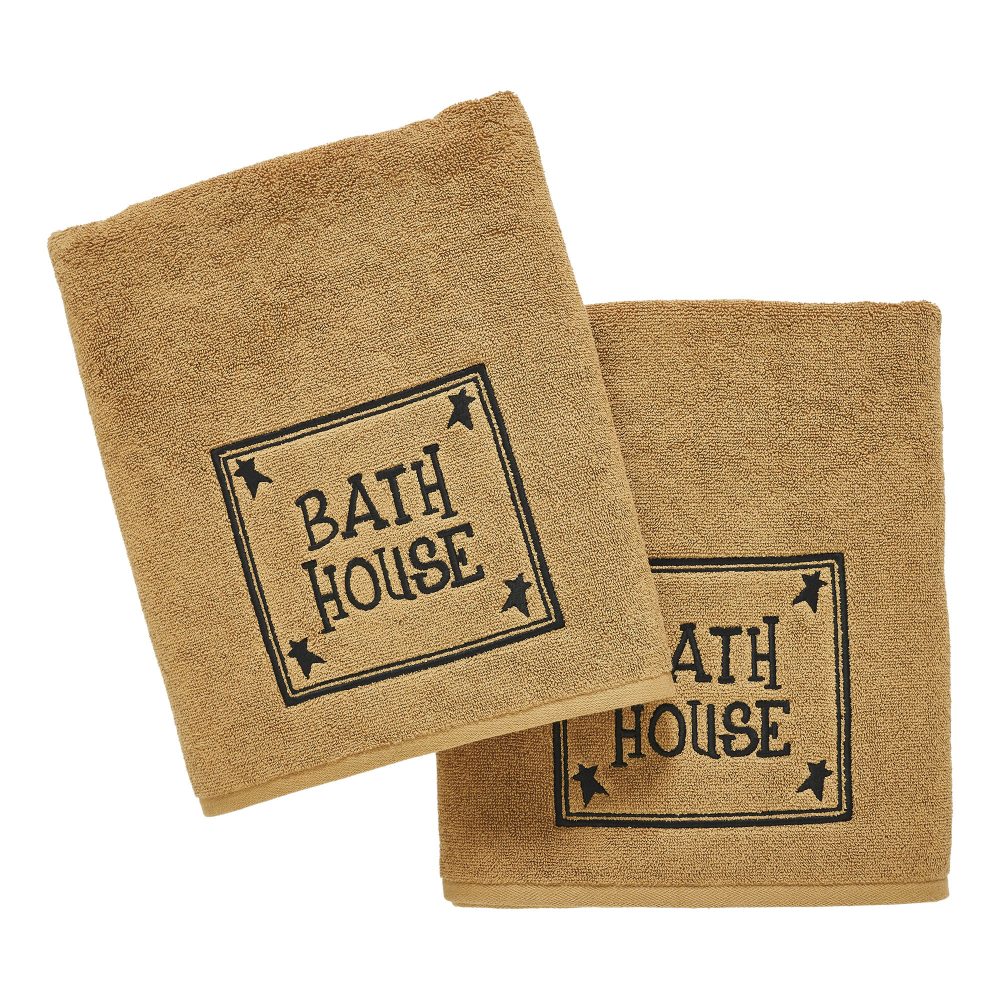 Add rustic charm to your bathroom with the VHC Brands Bath House Prim Stars Tan Bath Towel Set of 2. These thick and plush bath towels are crafted from soft, absorbent cotton terrycloth, ensuring both comfort and functionality. The warm doe tan hue serves as a neutral, inviting backdrop, while the embroidered design at the bottom adds a decorative touch with primitive stars in each corner surrounding the framed quote "Bath House" in rich black. Each bath towel measures 27x54 inches, making them generously sized for use after a bath or shower. The embroidered stars and bold text bring a timeless, rustic appeal that complements country or farmhouse-style bathrooms. Machine washable for easy care, these towels maintain their softness and durability, offering practical use while enhancing the aesthetic of your washroom. The VHC Brands Bath House Prim Stars Tan Bath Towel Set combines practicality with primitive style. Perfect for adding a cozy, country-inspired touch to your bathroom, these towels are designed to provide everyday luxury while serving as a decorative accent that elevates the overall look of your space.