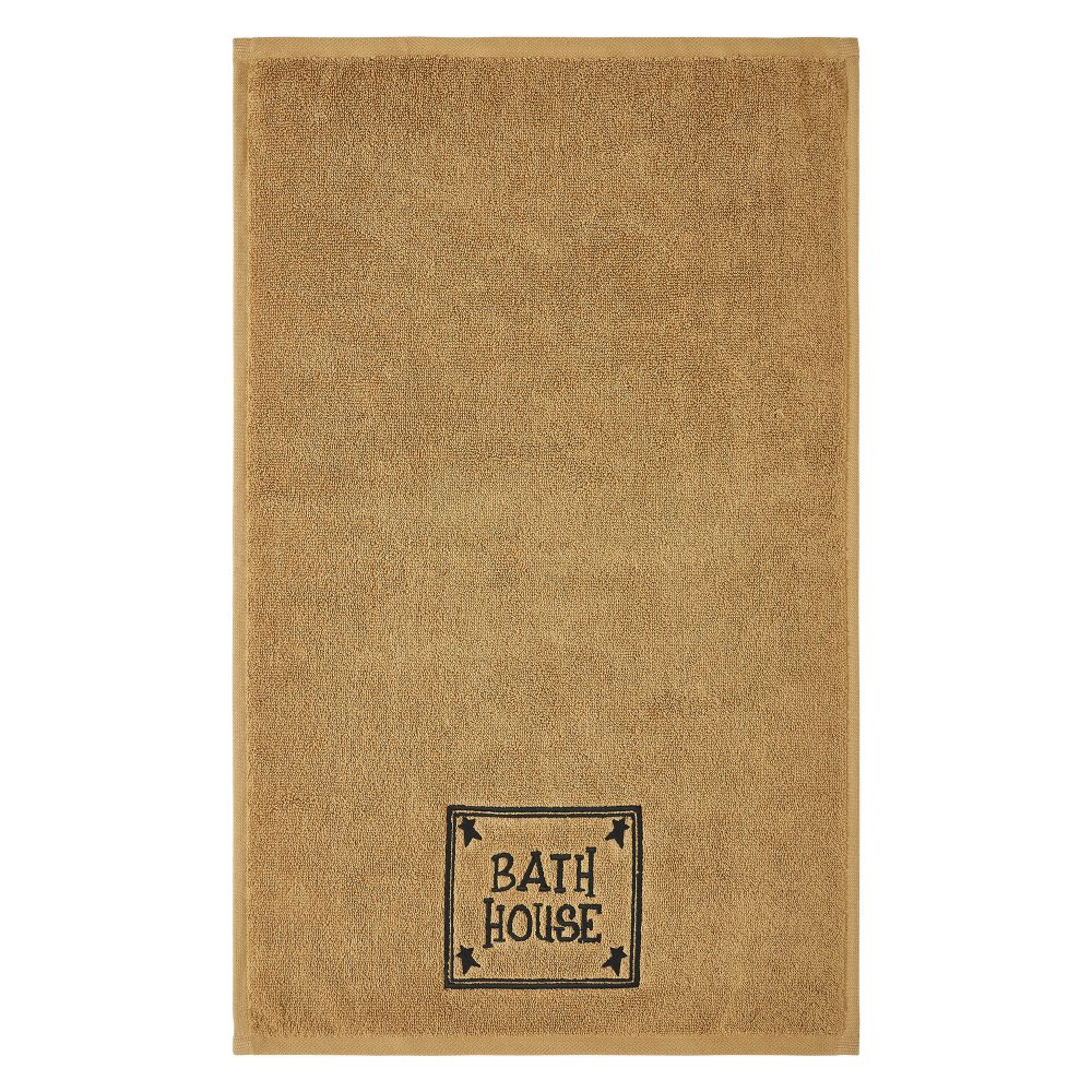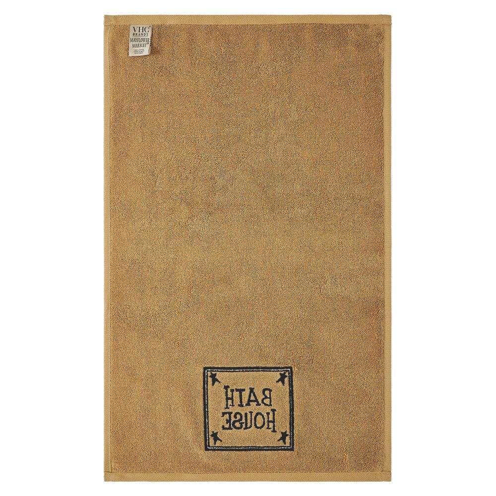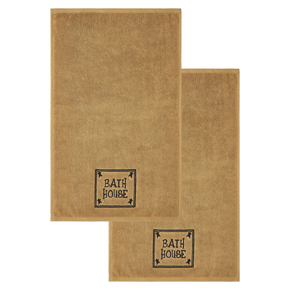 Add a touch of rustic charm to your bathroom with the VHC Brands Bath House Prim Stars Tan Hand Towel Set of 2. Crafted from thick and plush terrycloth, these cotton hand towels are both soft and absorbent, providing a cozy and functional addition to your daily routine. The warm doe tan hue of the towels serves as a perfect backdrop for their intricate embroidered design, adding a decorative touch that enhances any country washroom or farmhouse-inspired space. At the bottom of each hand towel, you'll find primitive stars delicately embroidered in each corner, surrounding a framed quote that reads "Bath House" in a bold rich black color. This thoughtful design not only adds visual interest but also reflects a timeless rustic aesthetic that complements a variety of bathroom styles. Whether displayed for decorative purposes or used for daily drying, these towels bring a cozy, lived-in feel to your home. Measuring 16x26 inches, the VHC Brands Bath House Prim Stars Hand Towel Set is the perfect size for hanging near the sink or on a towel rack. These machine-washable towels are easy to care for, making them a practical choice for families and frequent use. Elevate the look and feel of your bathroom with this beautifully crafted towel set that combines functionality with primitive country style.