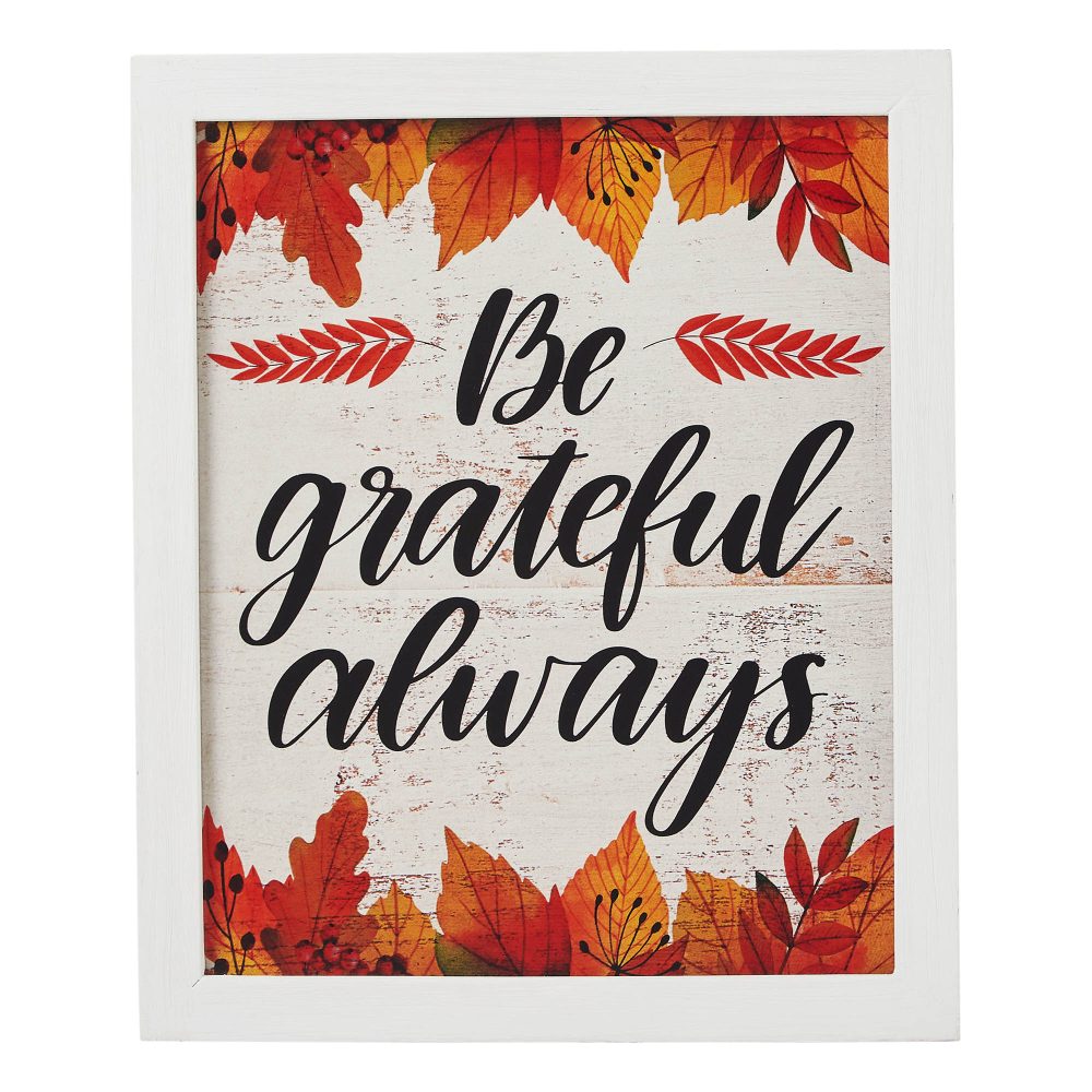 - ELEVATED DESIGN & DURABLE CONSTRUCTION: Measuring a charming 12×10 inches, this inspirational wall sign is expertly crafted from resilient MDF, featuring a distressed, vintage-inspired finish that enhances its rustic elegance. The uplifting “Be Grateful Always” message is beautifully complemented by delicate fall leaves in soft light creme, burnt orange, and sunny marigold yellow hues. Designed for versatile display, it includes pre-drilled holes for effortless hanging and also offers freestanding capability for shelves or mantels, ensuring seamless integration into any farmhouse, cottage, or harvest-themed space with simple, soft-cloth maintenance.