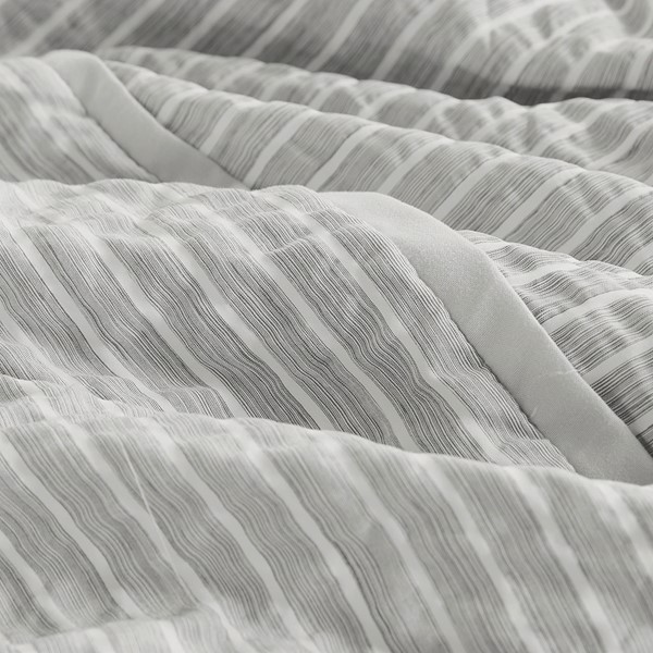 When you add Beautyrest’s Apollo striped comforter set to your bed, you will create a relaxing vibe in your bedroom. The oversized comforter features ivory stripes on soft gray seersucker fabric that pair well with both solids and patterns. A soft microfiber reverse adds extra comfort and matching shams complete the casual cozy look, transforming your bedroom into a space of pure comfort and relaxation.