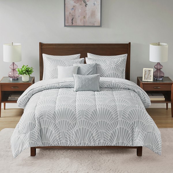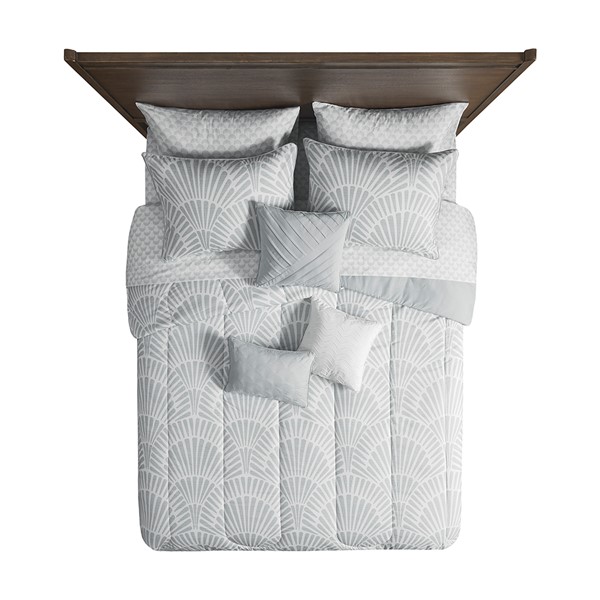 Refresh your bedroom style with the Beautyrest Conway 10 Piece Comforter Set with Bed Sheets. The comforter features a grey and white geometric art deco pattern for an elegant look, while matching shams and 3 decorative pillows complete the comforter set. A coordinating printed microfiber sheet set is also included, complete with 1 flat sheet, 1 fitted sheet, and 2 pillowcases. Machine washable for easy care, the comforter and sheet set have a moisture-wicking treatment on the fabric to help keep you cool and comfortable for a better night’s sleep.