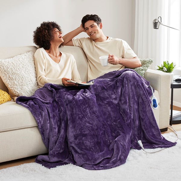 This electric blanket in queen size comes with dual controls, a 9-hour sleep timer, and a 20-setting heat selector. It can be connected to a smart device for voice control and is incredibly cozy and warm in a deep purple color, making it perfect for cold nights.