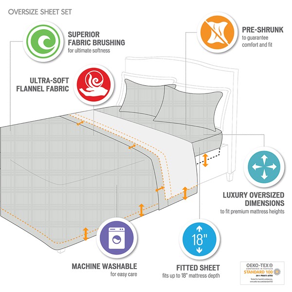 Sleep in warm and ultra-soft comfort with the Beautyrest Oversized Cotton Flannel Sheet 4 piece sheet set. This flannel sheet set features superior brushed fabric for incredible softness and oversized dimensions to fit premium mattresses. Pre-shrunk for a guaranteed comfort and secure fit. This sheet set is also OEKO-TEX certified, meaning it does not contain any harmful substances or chemicals to ensure quality comfort and wellness.