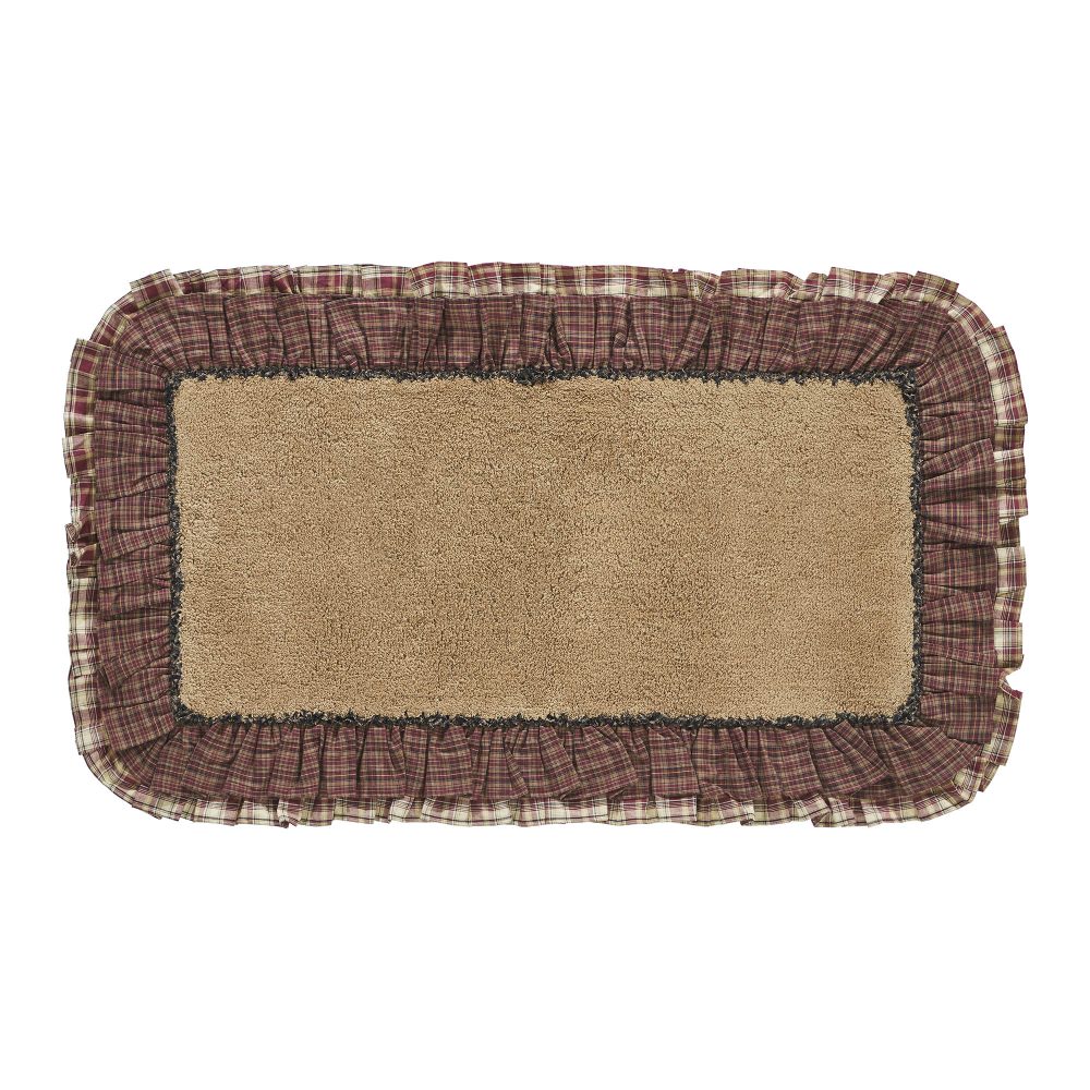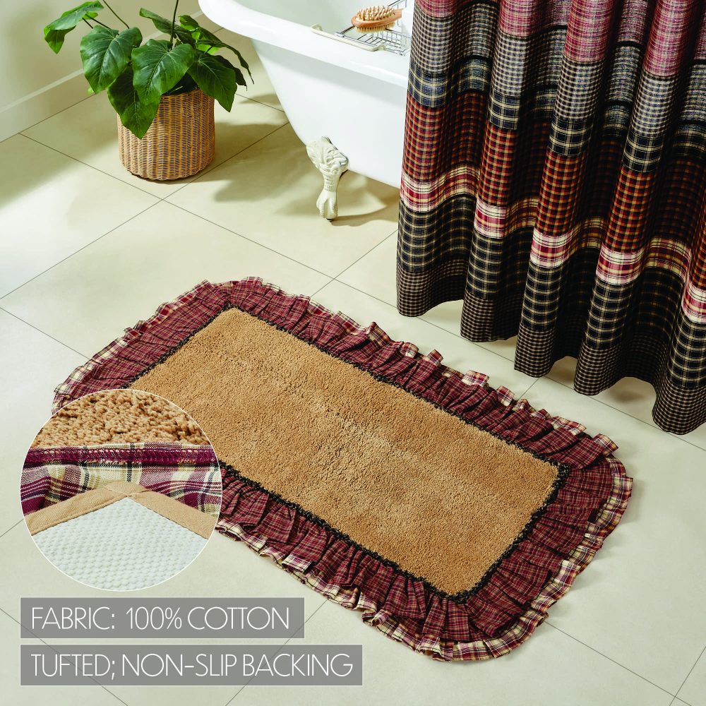 Step out of the shower and into cozy rustic country bliss. The Beckham Bath Mat 27x48 features a solid tan core in premium, ultra absorbent cotton. It is trimmed with a ruffled plaid fabric in deep tones of brick red, black and tan. Backed with textured rubber to produce a quality, non-slip surface without the need for a separate rug pad. This ruffled bath mat is a great finishing piece for bathrooms or laundry rooms where you need the perfect balance of style and functionality.