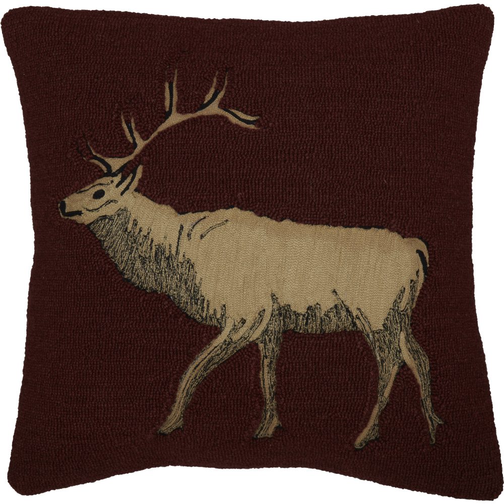 Welcome the great outdoors into your home with warm colors and rustic detail. The Beckham Elk Hooked Pillow proudly features a tan Elk front and center featuring a unique hook stitching technique for added texture and intricate detail. The background of this decorative pillow is covered in rust-red wool to complete the look. Reverses to 100% cotton matching solid red with button closures. Place this throw pillow on your favorite chair or in your bedroom to give your abode a classic country, lodge feel.