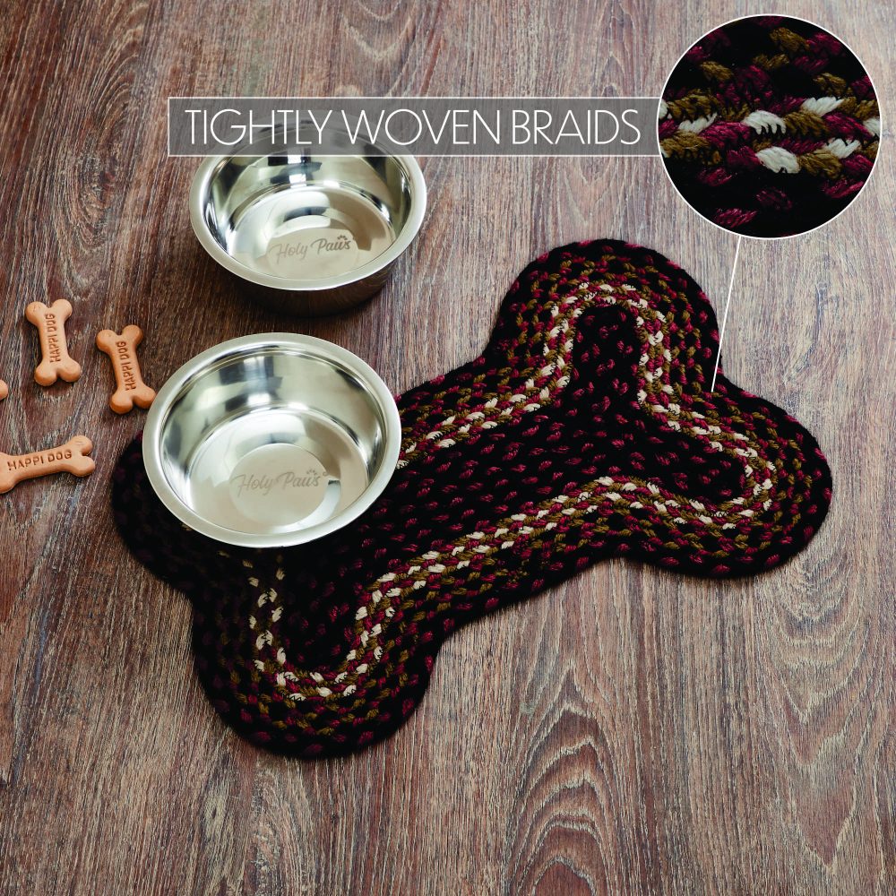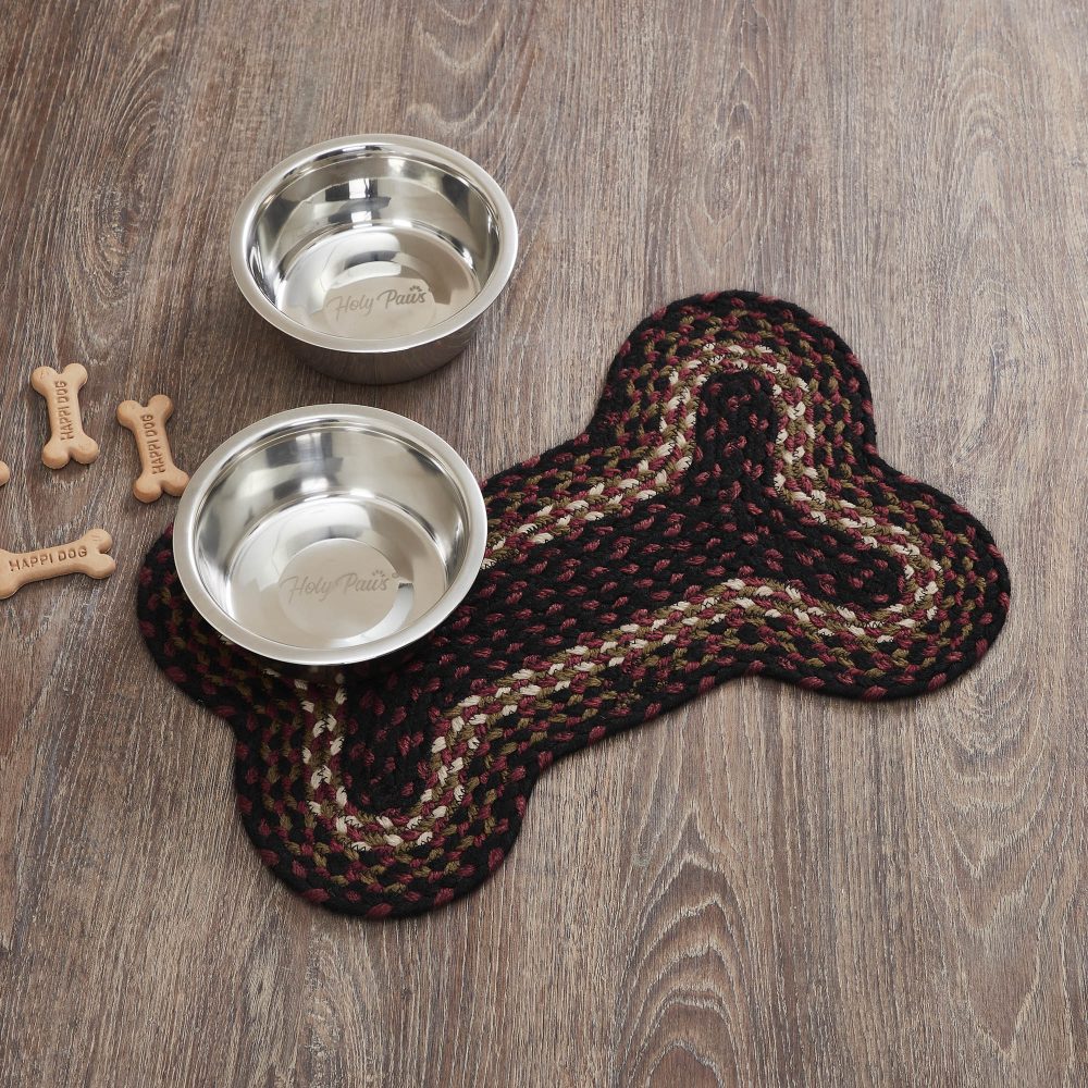 Give your pet a rug that is both stylish and practical. The Beckham Small Bone Rug measures 11.5x17.5 inches and is crafted with 100% recycled polyester material (PET) making it waterproof and durable. The bone-shaped pet rug is suitable for both indoor and outdoor use and is the perfect home for water and food bowls for small breed dogs. Rustic tones of brick red, country black and dark tan make this rug a great match for any classic country or primitive cabin decor.