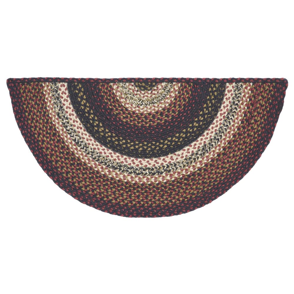 Create a warm, welcoming entryway or kitchen with deep primitive colors in a curl-resistant jute blend that adds style and safety wherever you stand. The Beckham Jute Rug measures 16.5x33 inches and features a classic half circle shape and tight braids constructed with a durable jute blend. The special blend relaxes faster and stays flat. Features a blend brick red, country black and dark tan for a dark, rustic look that complements a wide array of classic country and lodge decor.