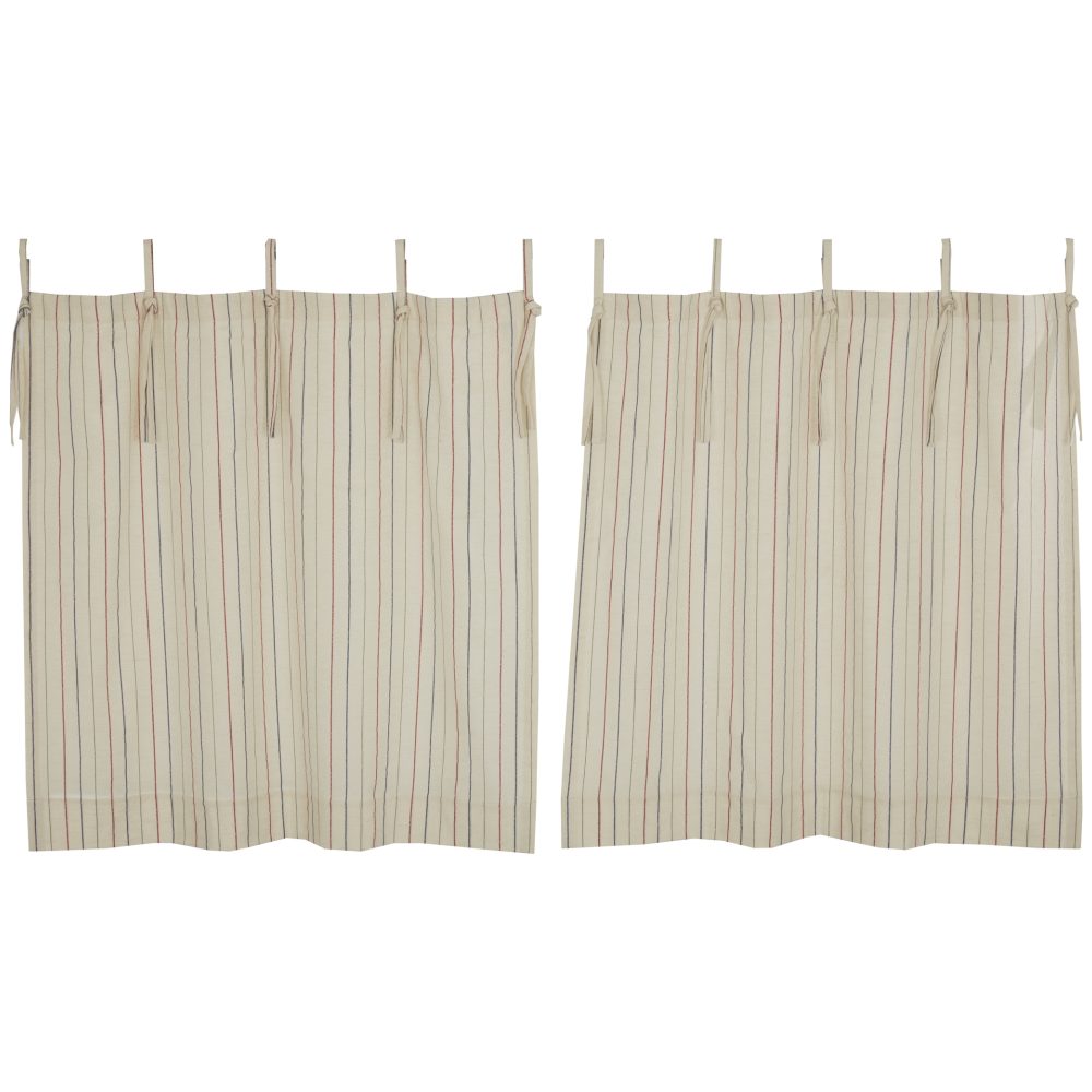 Add sweet simplicity to your farmhouse windows with the easy-going, casual style of Betsy Stripe Tie Top Tiers. The cream fabric is dressed up in thin vertical stripes of red, blue, and gray and the design seems to echo a love of flag and country in an innovative, understated design. The material is relaxed in its style with a slubbed appearance, (occasional raised threads) and the stripes bring a lovely regularity and graphic appeal that is fresh and crisp. The tiers are lined with cotton sheeting fabric which creates a lovely drape and adds more coverage and protection from the sun. The curtains have five tie tops that are actually knotted and sewn in place, with closed loops that easily accommodate most curtain rods. The secured loops create a chic style without the hassle and irregular look of actual ties. Set/2. Coordinate the tiers with other linens and in the Betsy Collection for a layered look that is personal and unique.