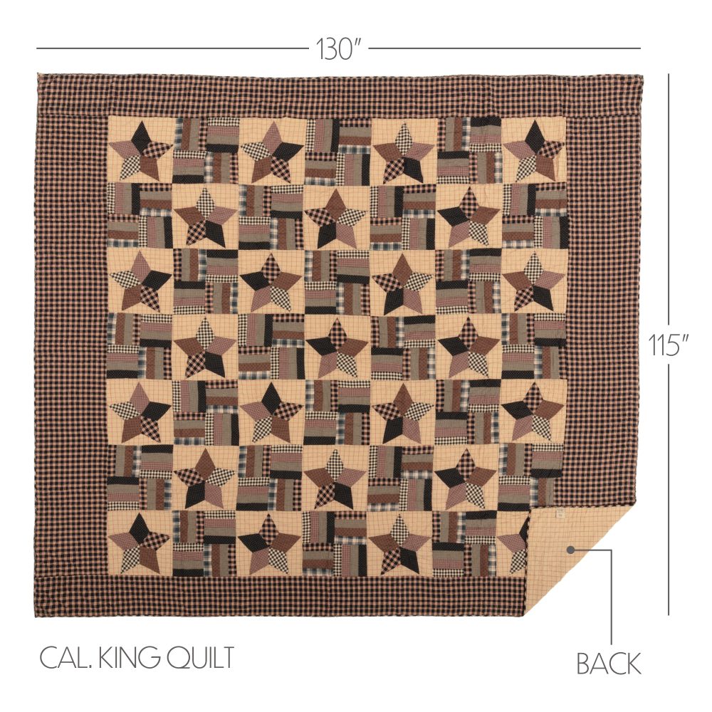 Add a primitive touch to your bedroom decor with warm, classic country tones of soft black, khaki tan and barn red. The Bingham Star California King Quilt includes one 130x115-inch quilt. The primitive country bedding features patchwork details in alternating five-point star and confetti strip blocks in a blend of vintage patterns for a handcrafted appearance. The blanket is machine washable and iron safe and crafted in 100 percent cotton for a soft feel and durable wear. The quilt reverses to a red and tan windowpane plaid. Coordinates with the Bingham Star Collection by VHC for matching rustic farmhouse window treatments, bathroom accessories and bedding.