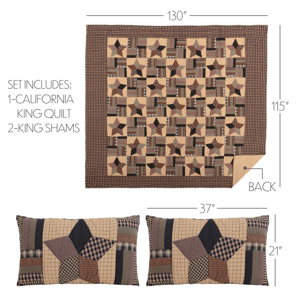 Add a primitive touch to your bedroom decor with warm, classic country tones of soft black, khaki tan and barn red. The Bingham Star Three-Piece California King Quilt Set includes one 130x115-inch quilt and two 21x37-inch quilted pillow shams. The primitive country bedding set features patchwork details in alternating five-point star and confetti strip blocks in a blend of vintage patterns for a handcrafted appearance. All items are machine washable and iron safe and crafted in 100 percent cotton for a soft feel and durable wear. Both the quilt and shams reverse to a red and tan windowpane plaid. Coordinates with the Bingham Star Collection by VHC for matching rustic farmhouse window treatments, bathroom accessories and bedding.