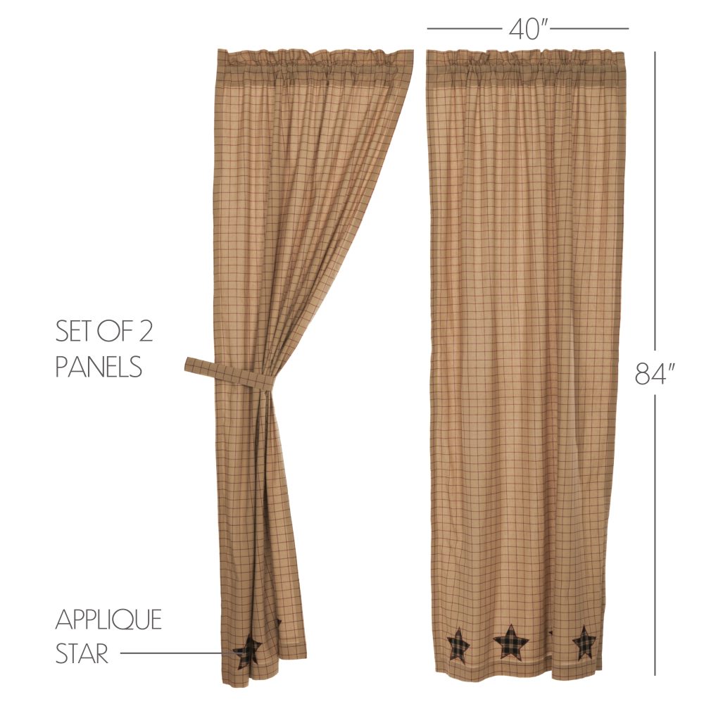 Decorate your windows with a touch of primitive country style with this charmingly designed and thoughtfully crafted window panel set. Displaying a timeless country look with a simple tan and red windowpane plaid base with a row of applique stars in rustic black plaid, the Bingham Star Panel Set 84x40 enhances your home decor with a sophisticated Americana feel. This 100% cotton curtain set includes two panels with a white lining to prevent fading and provide additional privacy. It includes a rod pocket for easy hanging.