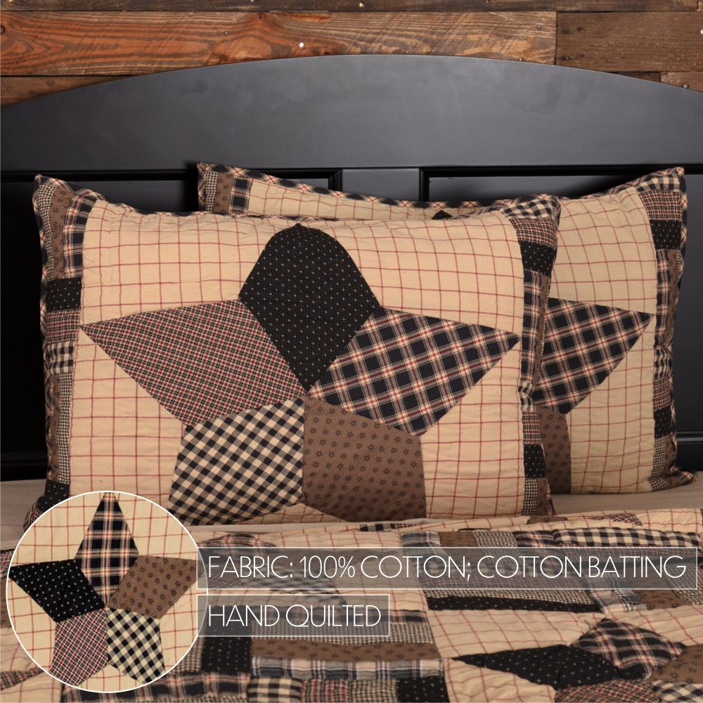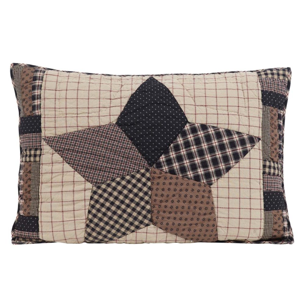 Warm, traditional tones of black, tan and barn red in a rich collection of vintage patterns form a rustic, cozy accent to your country style bedding. The Bingham Star Standard Sham includes one 21x27 sham pillow cover with a mix of long rectangular blocks forming a left and right border that brings attention to a central star design. This cotton pillow sham reverses to a tan and red windowpane plaid for an alternate look. The decorative pillow case includes a button-style closure to hold your fill pillow (not included) in securely. Machine washable and iron safe.