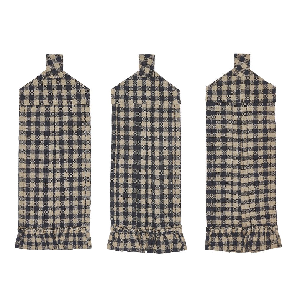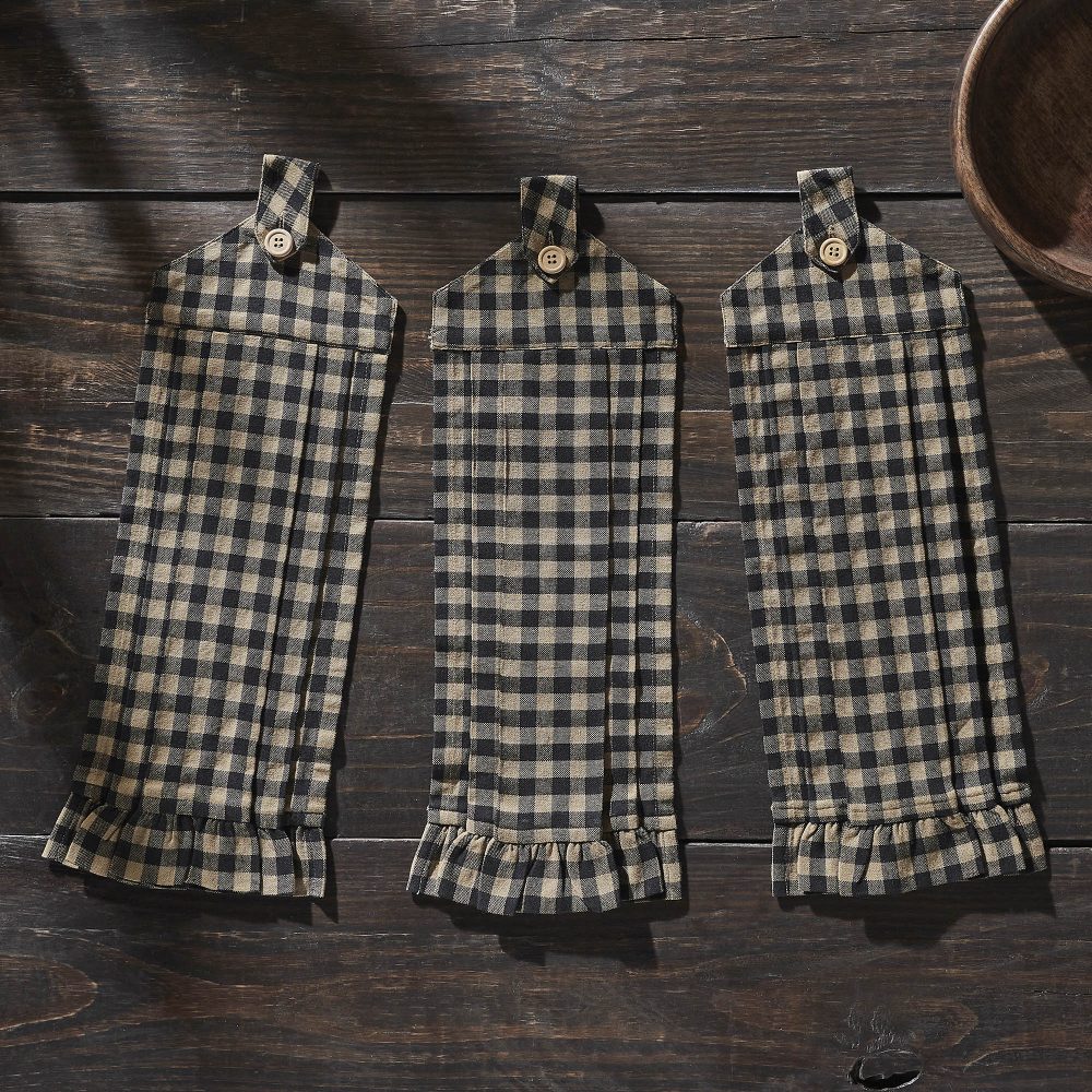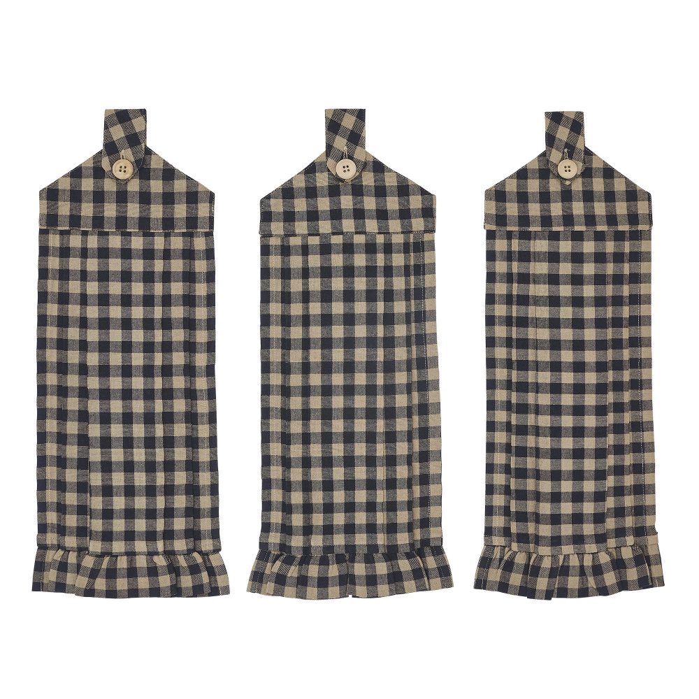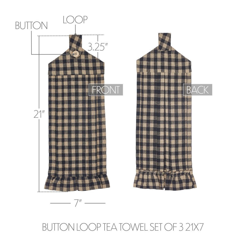 - Country Charm: Elevate your kitchen and bath decor with the VHC Brands Cotton Black Check Button Loop Kitchen Towel Set of 3. Featuring a timeless Country Black Check pattern, these towels exude rustic charm and add character to your space.