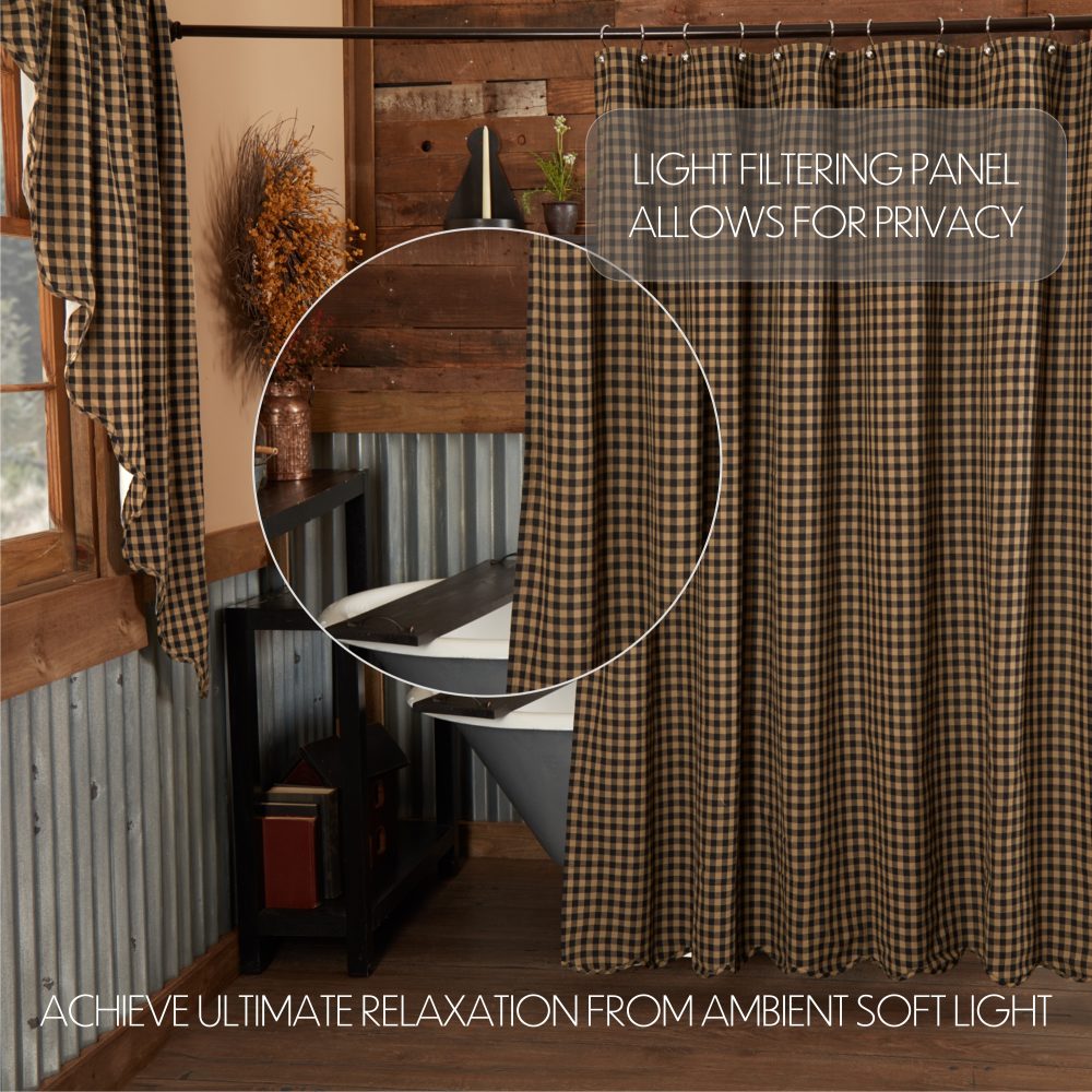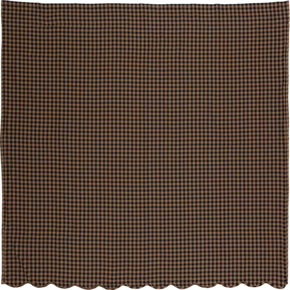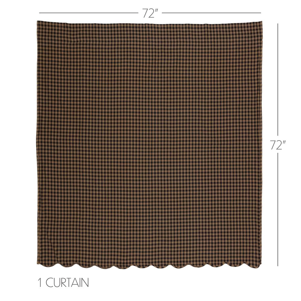 Decorate your bathroom with the perfect blend of simplicity and country charm with the Black Check Scalloped Shower Curtain. Featuring large scale black and tan checks beautifully accented by a scalloped bottom edge, our 72x72 fabric shower curtain provides a modern primitive touch to your bathroom decor. This machine washable, 100% cotton shower curtain includes button holes for shower hooks and a rod pocket for versatility and convenience.