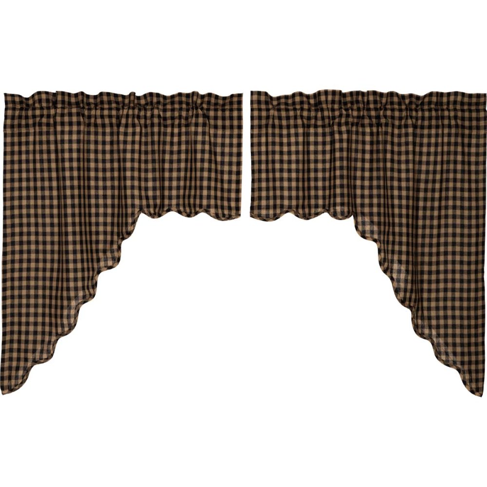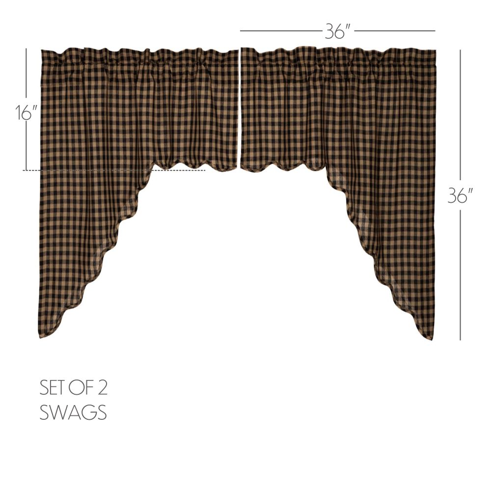 Decorate your windows with a touch of primitive country style with this charmingly designed and thoughtfully crafted window swag set. Displaying a timeless country look with a beautiful raven black and khaki tan checked plaid base with scalloped edging, the Black Check Scalloped Swag Set 36x36x16 enhances your home decor with a sophisticated modern primitive feel. This 100% cotton curtain set includes two swag panels with a white lining to prevent fading and provide additional privacy. It includes a rod pocket for easy hanging.