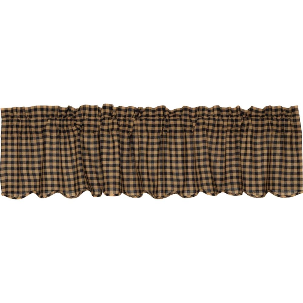Dark khaki tan and raven black checkered plaid add a relaxed, primitive feel to your windows. Our Black Check Scalloped Valance measures 16x72 inches and includes a softly scalloped edge. The rustic country valance is constructed with 100 percent cotton for easy care and is machine washable and iron safe. Includes a 3.25 inch rod pocket for easy hanging.