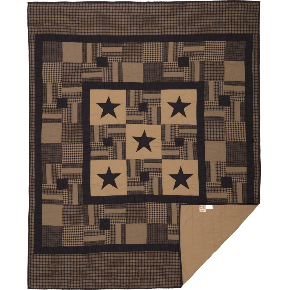 Add a primitive touch to your bedroom decor with deep, classic country tones of soft black and khaki tan. The Black Check Star Twin Quilt includes one 68x86-inch quilt. The primitive country bedding features patchwork details with prominent five-point stars and confetti strip blocks surrounded by a solid and checked plaid border. The quilt is machine washable and iron safe and crafted in 100 percent cotton for a soft feel and durable wear. It reverses to solid tan. Coordinates with the Black Check Star Collection by VHC for matching rustic farmhouse window treatments, bathroom accessories and bedding.