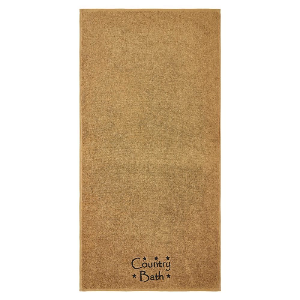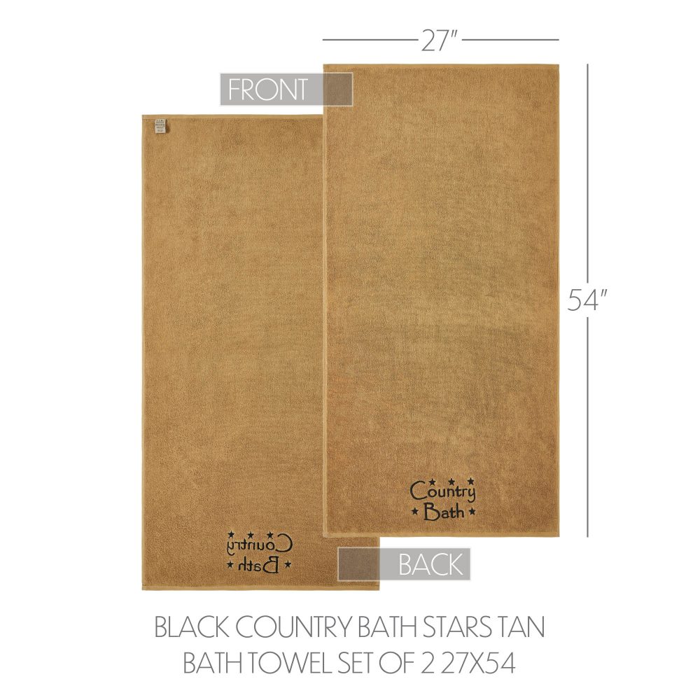 Add a charming farmhouse touch to your bathroom with the VHC Brands Black Country Bath Stars Tan Bath Towel Set of 2. Made from luxurious and soft cotton terrycloth, these bath towels provide comfort and absorbency for everyday use. The warm doe tan hue offers a neutral, inviting backdrop, while the embroidered design at the bottom features rustic stars encircling the bold phrase "Country Bath" in deep black, adding a distinctive country-inspired accent. Each towel measures 27x54 inches, making them perfect for use after a shower or bath. The embroidered stars and text bring a timeless farmhouse aesthetic, ideal for enhancing the look of your country-style washroom. These towels are not only decorative but also highly functional, being machine washable for easy care and long-lasting softness. The VHC Brands Black Country Bath Stars Tan Bath Towel Set combines everyday practicality with rustic elegance. Perfect for those who appreciate farmhouse charm, these towels provide a cozy, stylish accent while remaining durable and easy to maintain. Elevate your bathroom decor with these beautifully crafted and functional towels.