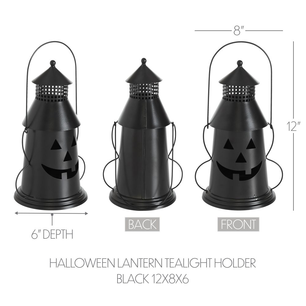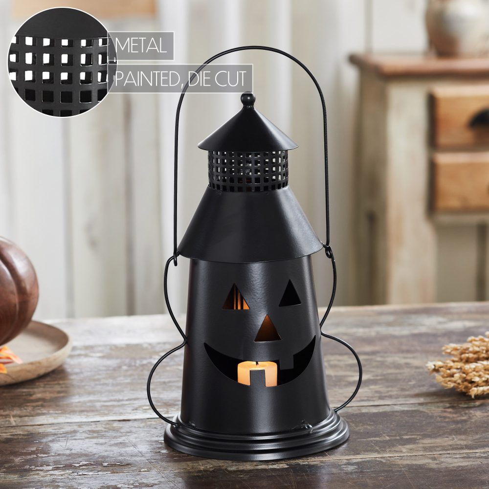 - ELEGANTLY SPOOKY DESIGN. Add a touch of rustic Halloween charm with this 12-inch tall VHC Brands metal lantern, featuring a distressed black finish and iconic Jack-O-Lantern cutout designed to cast enchanting shadows; perfectly sized as an indoor tabletop accent or votive and tealight candle holder (candles not included), this durable piece includes a sturdy carry handle for easy placement and simple maintenance for years of seasonal enjoyment.