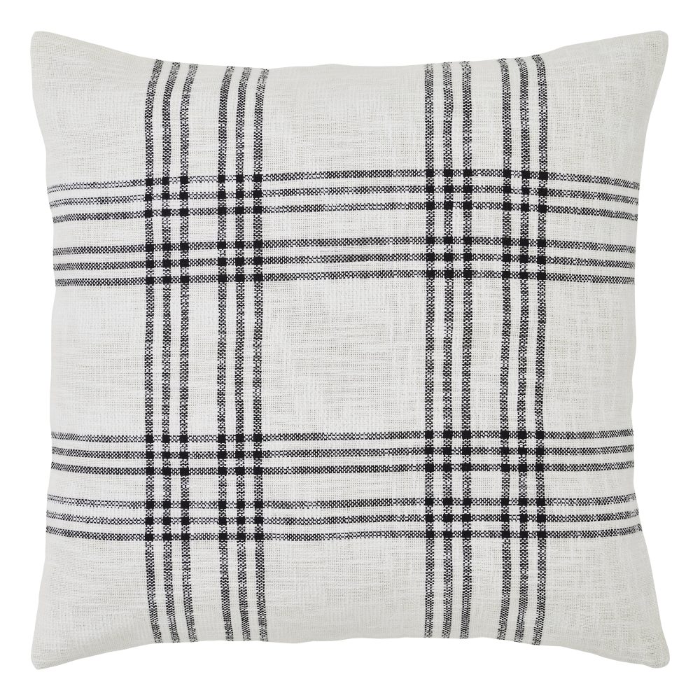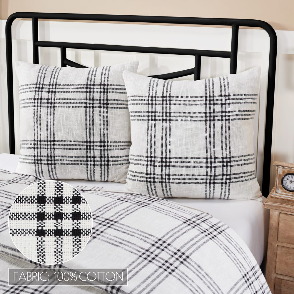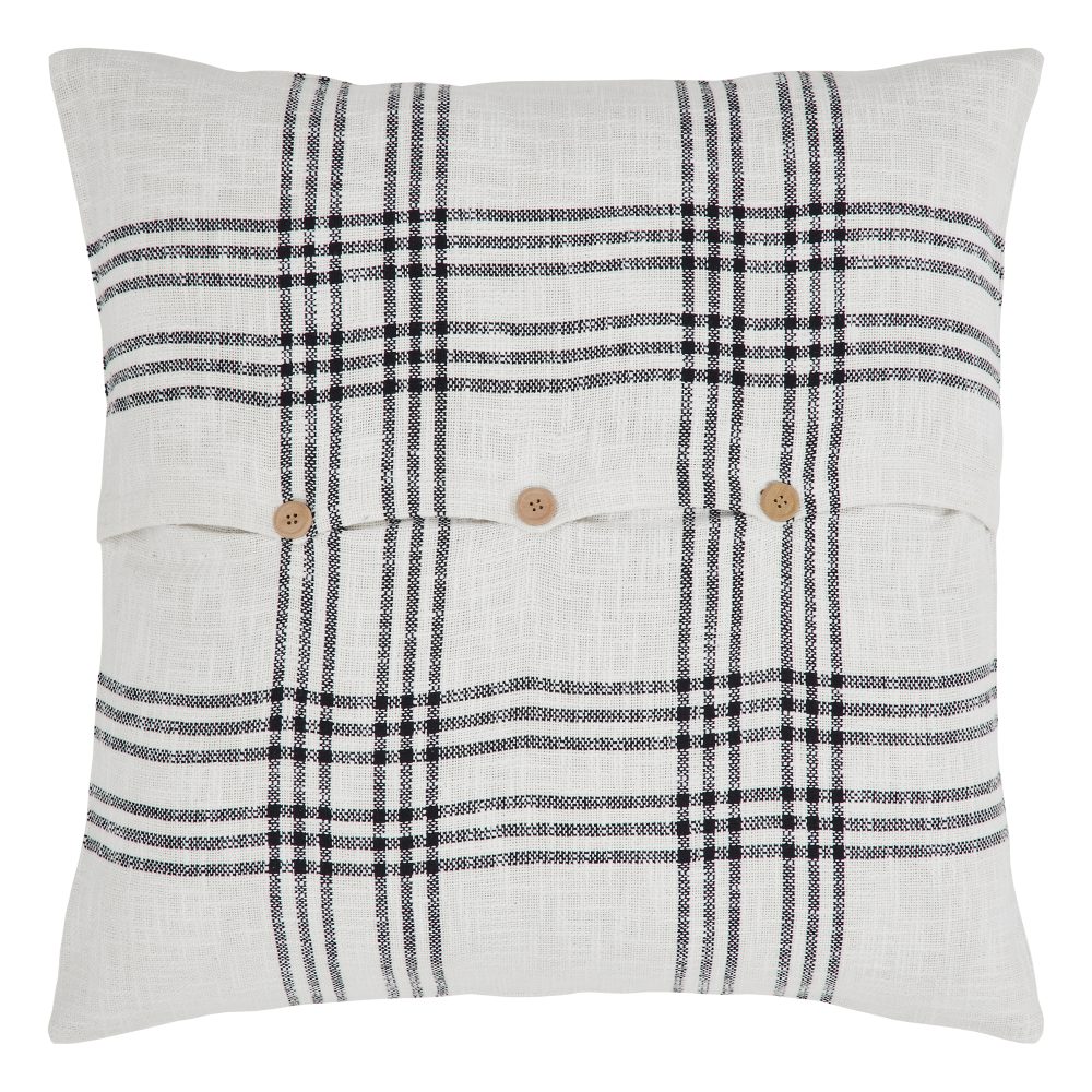 A soft white and black woven fabric creates a texture-filled focal point for your classic farmhouse decor. The Black Plaid Fabric Euro Sham measures 26x26 inches and features a white base with bold black striping to form a large-scale, classic plaid pattern. Pillow sham features clean, knife-style edging to complement the simple styling of farmhouse decor. Includes simple wooden buttons to hold your fill pillow (not included) in securely. The Black Plaid Collection from VHC easily transitions between the seasons and seasonal accents can be added to effortlessly transform the look of your decor. Machine washable and iron safe.