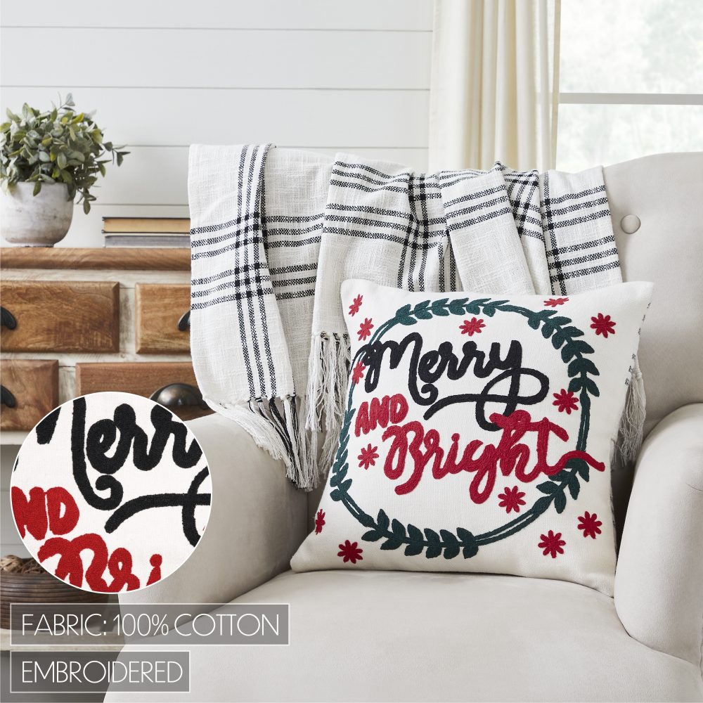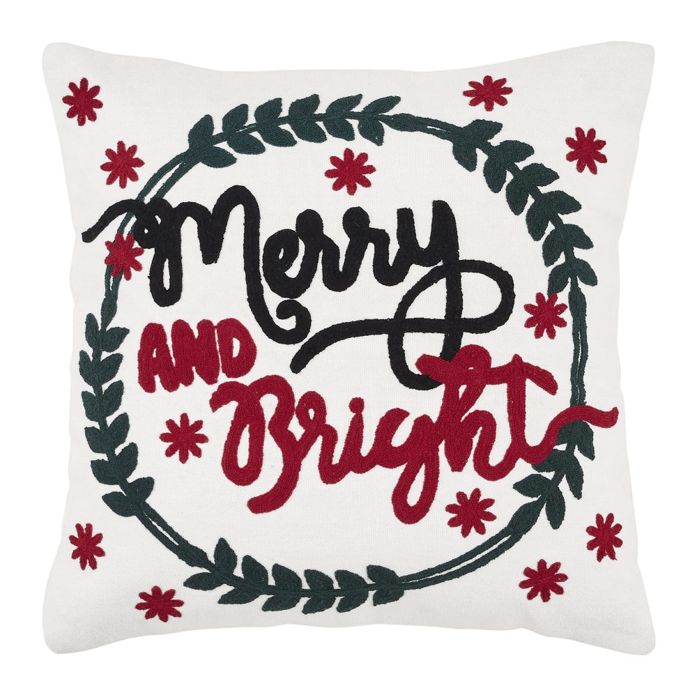 - HOLIDAY EMBROIDERY: Bold embroidery in bright shades of cherry red and pine green feature the phrase, Merry and Bright surrounded by a textured wreath and a sprinkle of snowflakes for a cheerful, festive design.