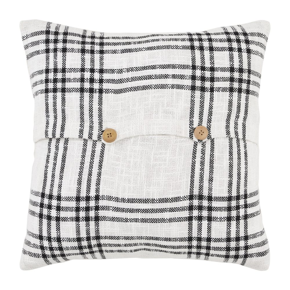 Light up your room with a festive holiday accent pillow with sleek farmhouse charm. The Black Plaid Merry & Bright Pillow measures 18x18 inches and features a bold embroidered design that reads, Merry and Bright in festive shades of black and cherry red. The phrase is surrounded by a textured wreath in pine green that is surrounded by a sea of snowflakes in red. The holiday pillow reverses to a simple black and white plaid with button-style closures for easy cleaning. The outer shell of the pillow is 100 percent cotton with a bouncy polyester fill for a cozy, comfortable cushion that adds style to a wide variety of couches, chairs and more. Coordinates with the Black Plaid Collection by VHC to take your modern farmhouse decor through the seasons in fresh, livable style.
