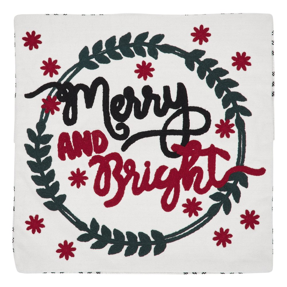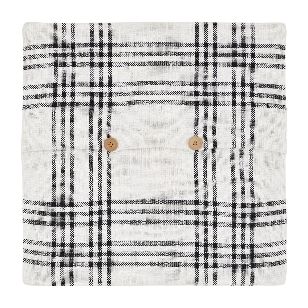 Add a festive Christmas touch to your home with our 18x18 Black Plaid Merry & Bright Pillow Cover. Rich colors of cherry red and soft black and white add a farmhouse element and neutral backdrop to offset your decor. This accent pillow cover reverses to a black plaid with light wooden buttons. The embroidered Christmas lettering in the center of this 100% cotton canvas pillow cover completes the look for a classic holiday approach.
