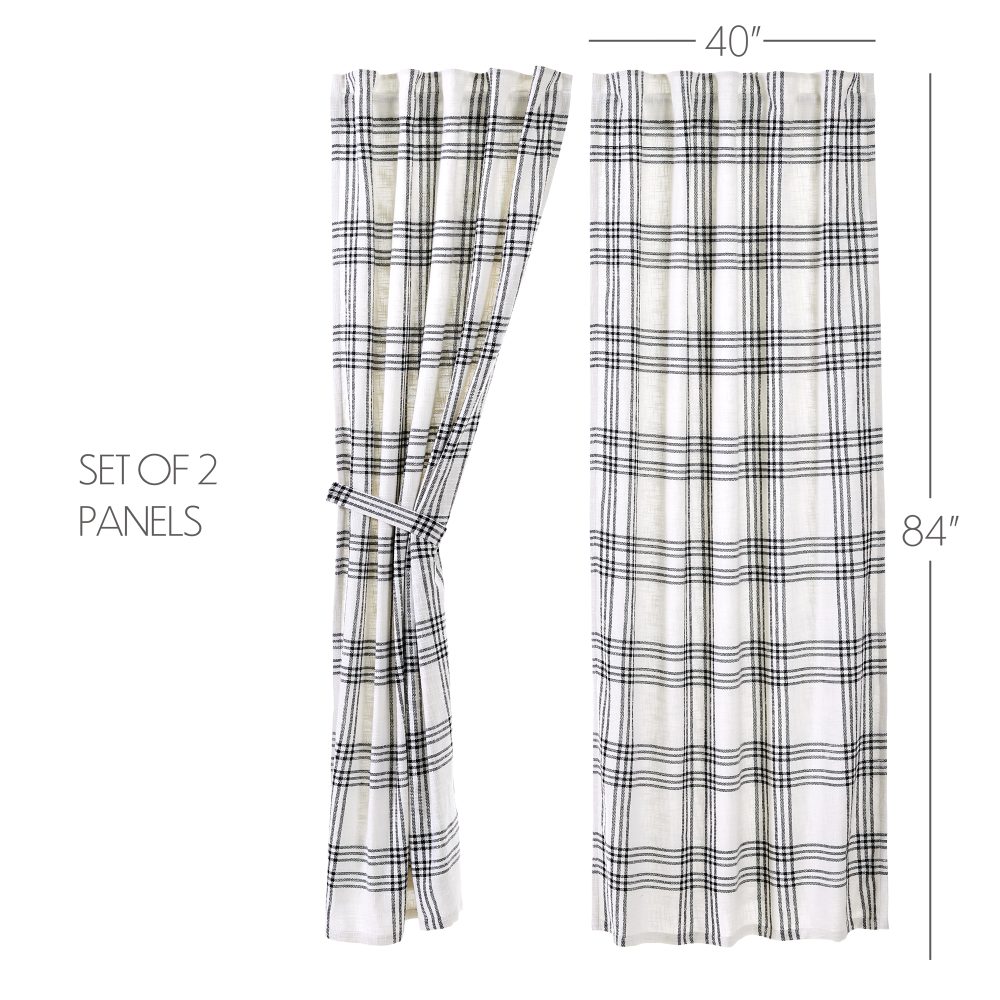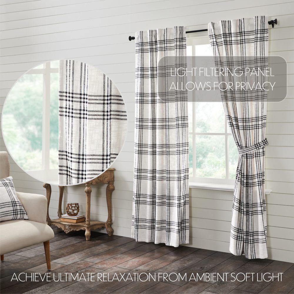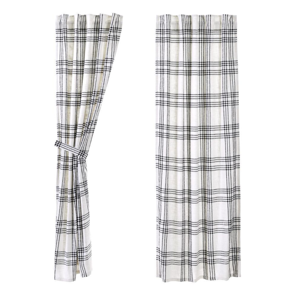 Create a clean, modern farmhouse look with our Black Plaid Panel Set. The charming 84 x 40 inch curtains feature neutral black and white plaid in a textured, woven fabric made with 100% cotton. Lined to prevent fading and to provide additional privacy. Features rod pockets and loops for easy hanging. Includes matching tie backs.