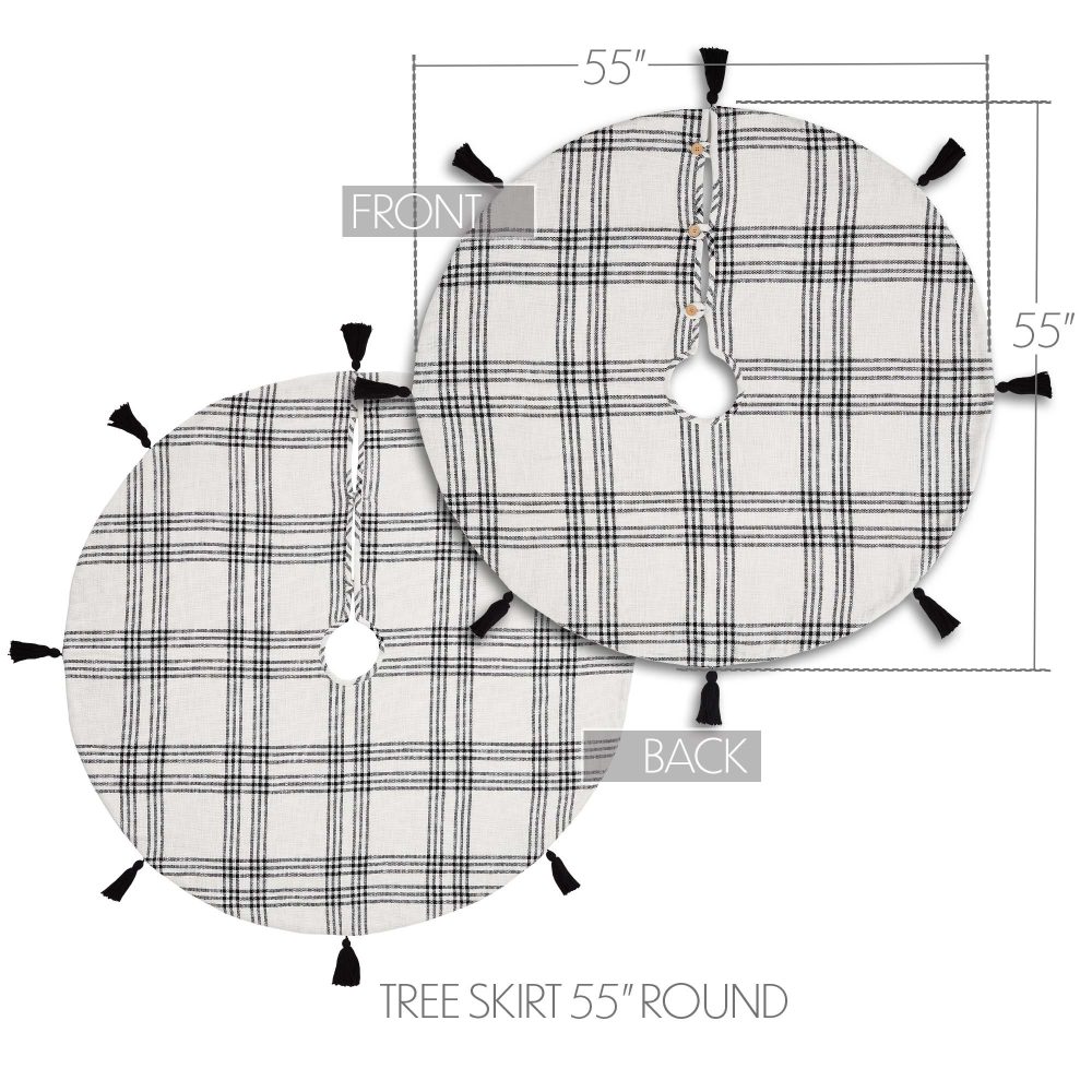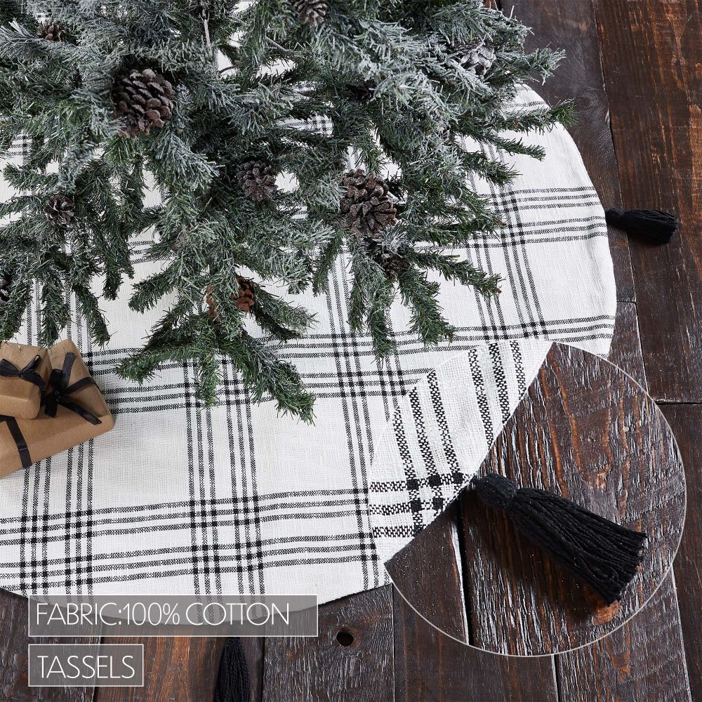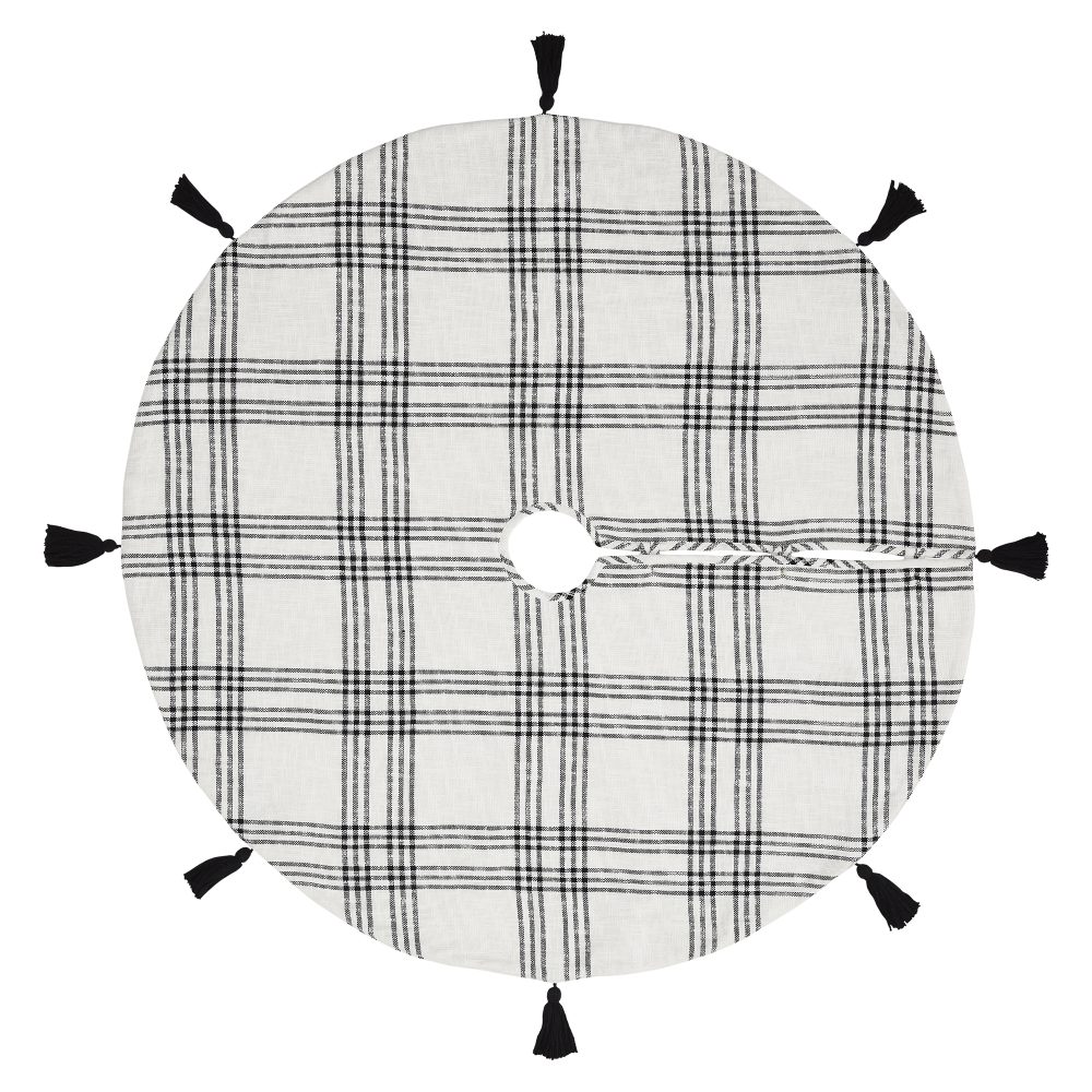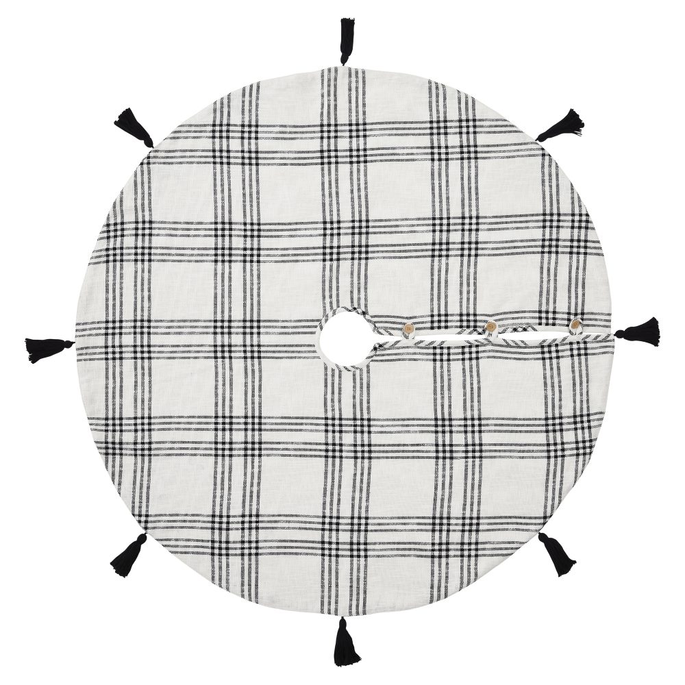 Add modern style to your Christmas traditions with the Black Plaid Tree Skirt. The round tree skirt features a 55 inch diameter. A crisp white base with country black stripes will add simple, sophisticated style for a perfect farmhouse Christmas look. Regularly spaced black tassels add a festive touch to the design. The elegant Christmas tree skirt is made for yearly use with a cotton base and flannel lining. Pair with matching stockings for a complete, festive holiday look.