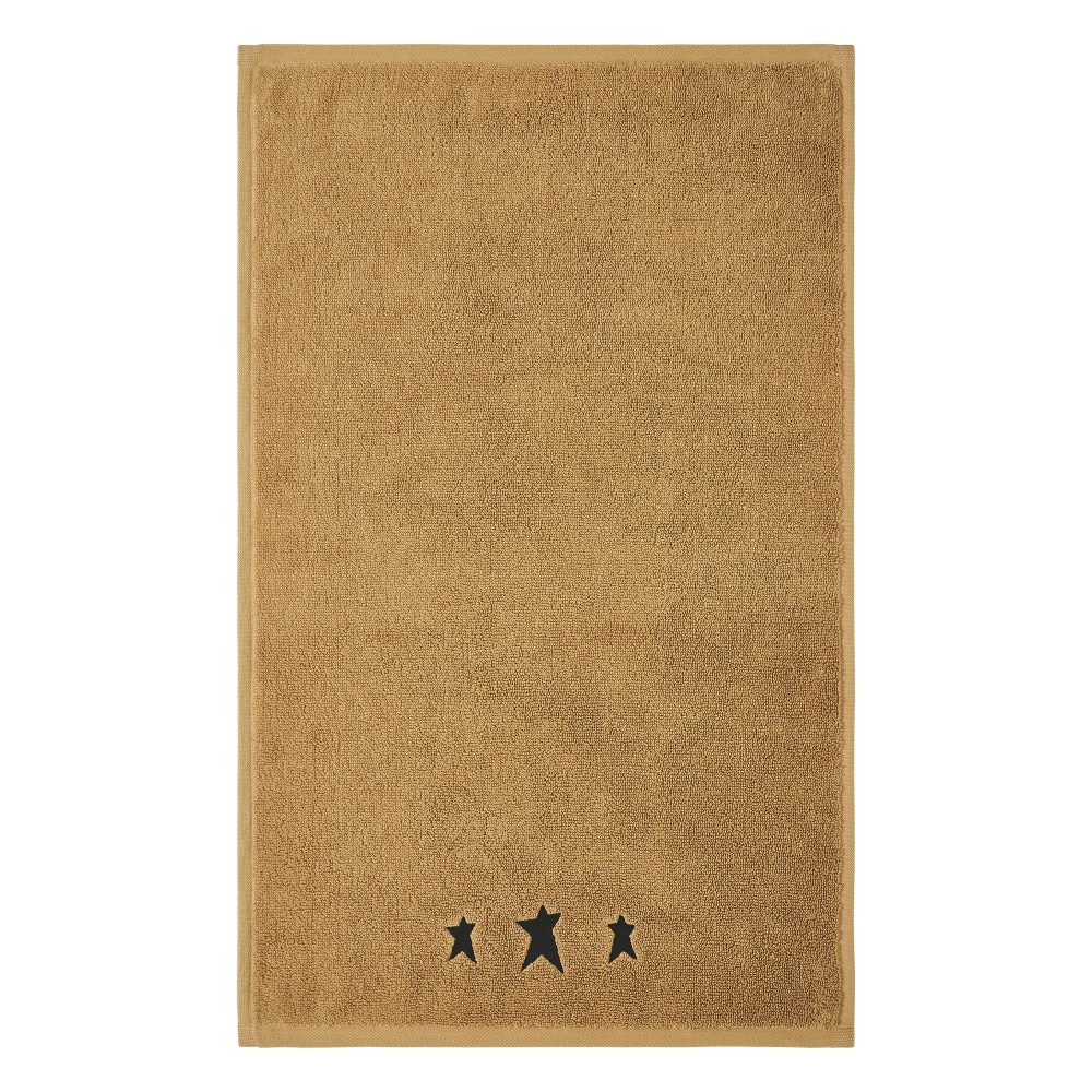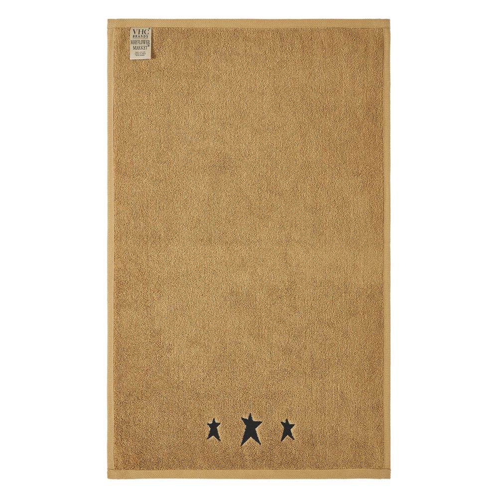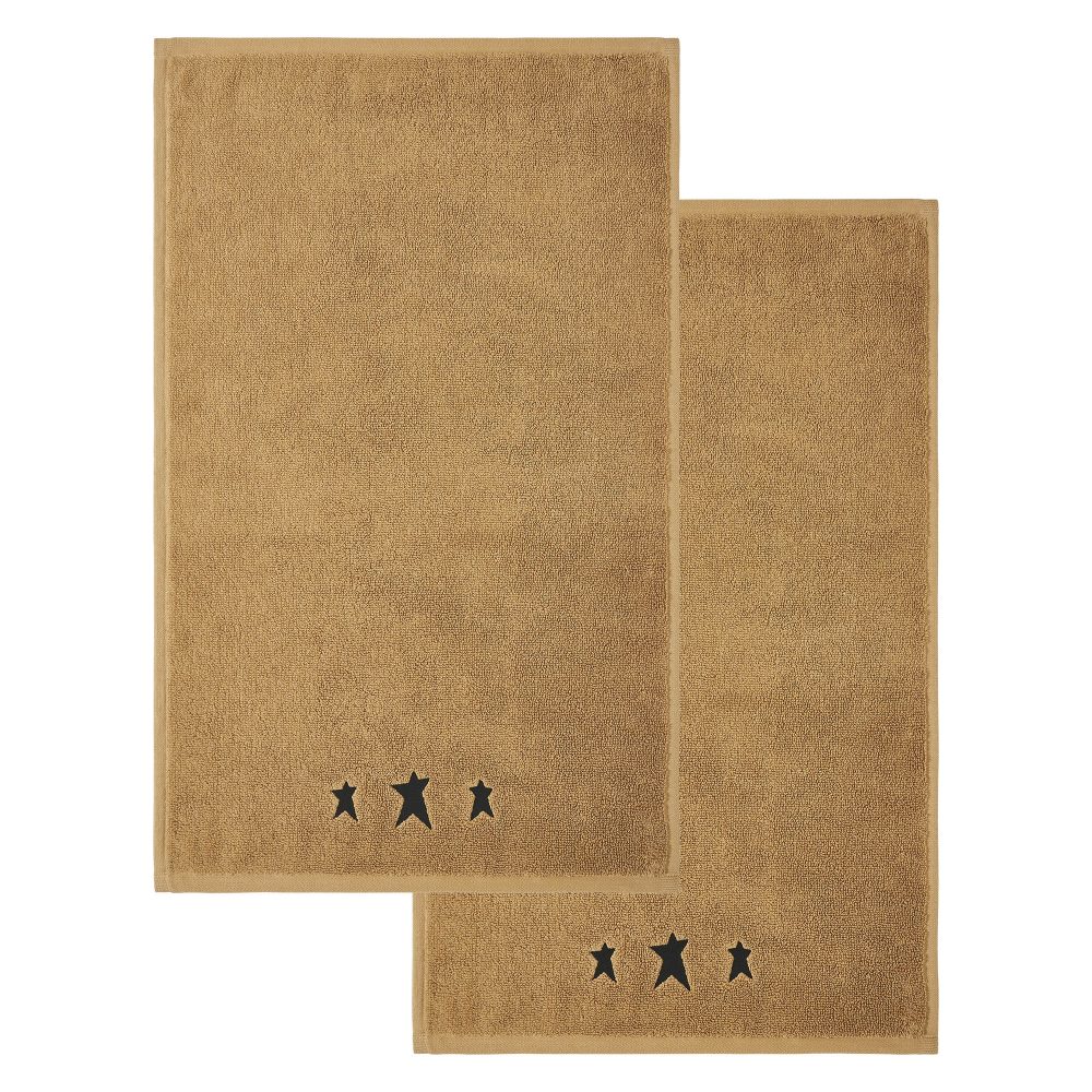 Bring a touch of rustic charm to your bathroom with the VHC Brands Black Prim Stars Tan Hand Towel Set of 2. Made from soft and absorbent cotton terrycloth, these hand towels offer both comfort and durability for everyday use. The neutral doe tan hue provides a warm, versatile background, while the embroidered design at the bottom showcases three primitive stars in rustic black, adding a charming, rustic feel to any bathroom decor. Measuring 16x26 inches, these hand towels are the perfect size for hanging near the sink or on a towel bar, offering practicality with a decorative touch. The primitive star design is ideal for creating a cozy and welcoming atmosphere in a rustic or country-style washroom. These towels are machine washable for easy care, making them as functional as they are beautiful. The VHC Brands Black Prim Stars Tan Hand Towel Set combines timeless rustic design with modern functionality. Perfect for adding a primitive flair to your home, these towels offer a stylish yet practical addition to your bathroom, elevating the look of your space with their simple yet striking design.
