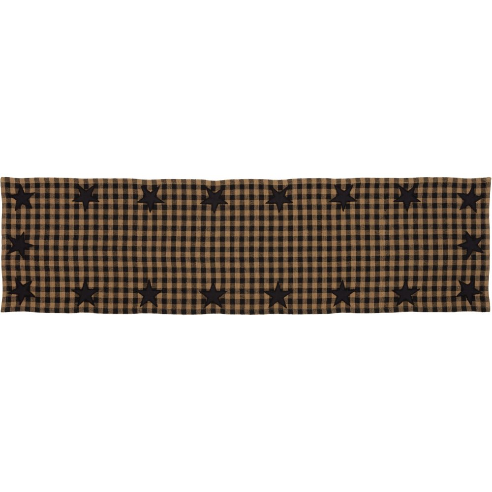 Create a joyful table for cozy family dinners with vintage tones and classic patterns. The Black Star Runner includes one table runner measuring 13x48 inches made from a premium 100 percent cotton weave. The timeless look of buffalo checked plaid is given a primitive twist with raven black and deep khaki tan tones and appliqued star accents for bold country style. Complete your tabletop decor with other pieces from the Black Star Collection by VHC for vintage farmhouse style.